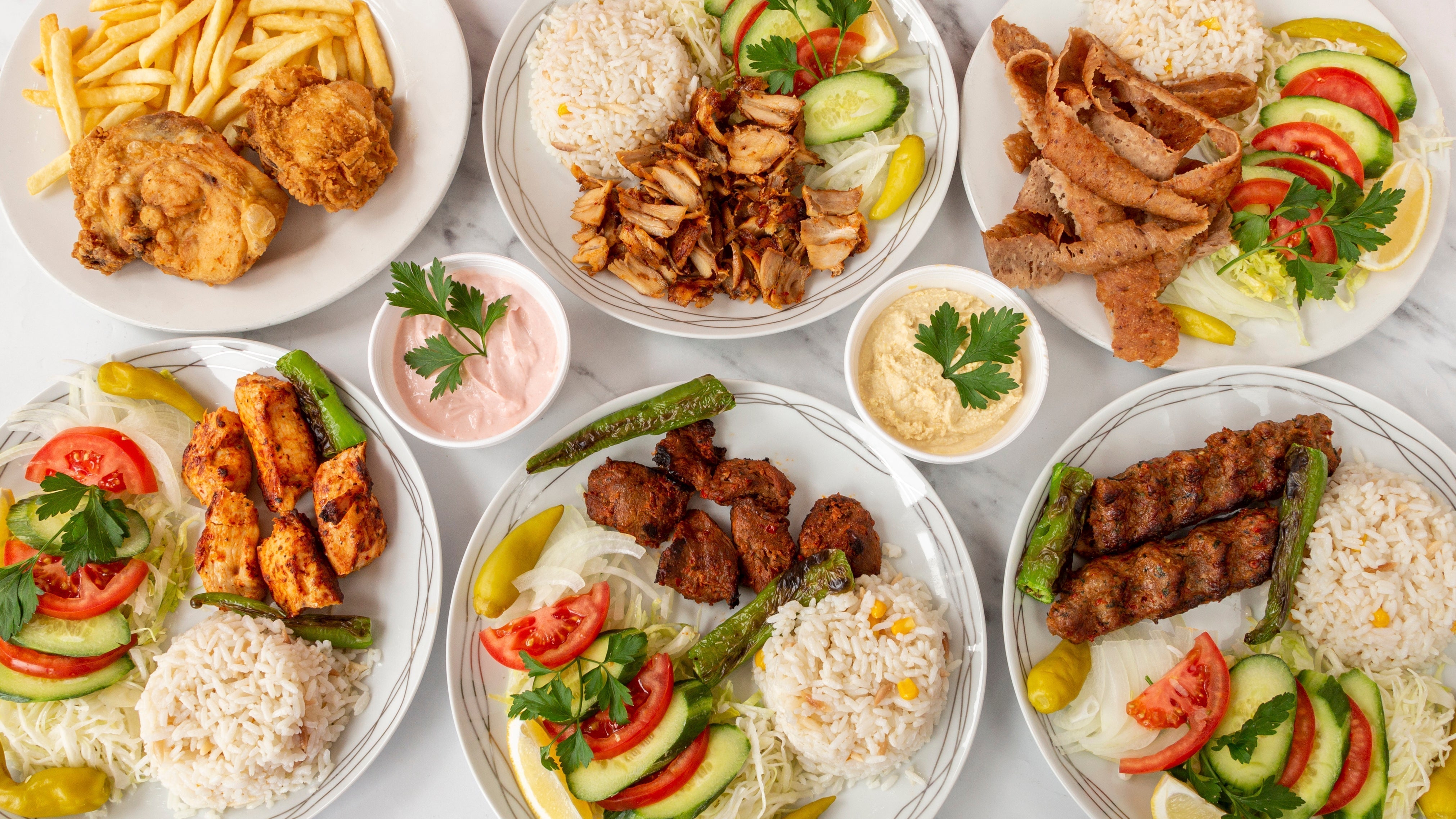 Served with flat bread, chicken doner, lamb doner,chicken shish, lamb shish & veggie kebab all together.£19.95