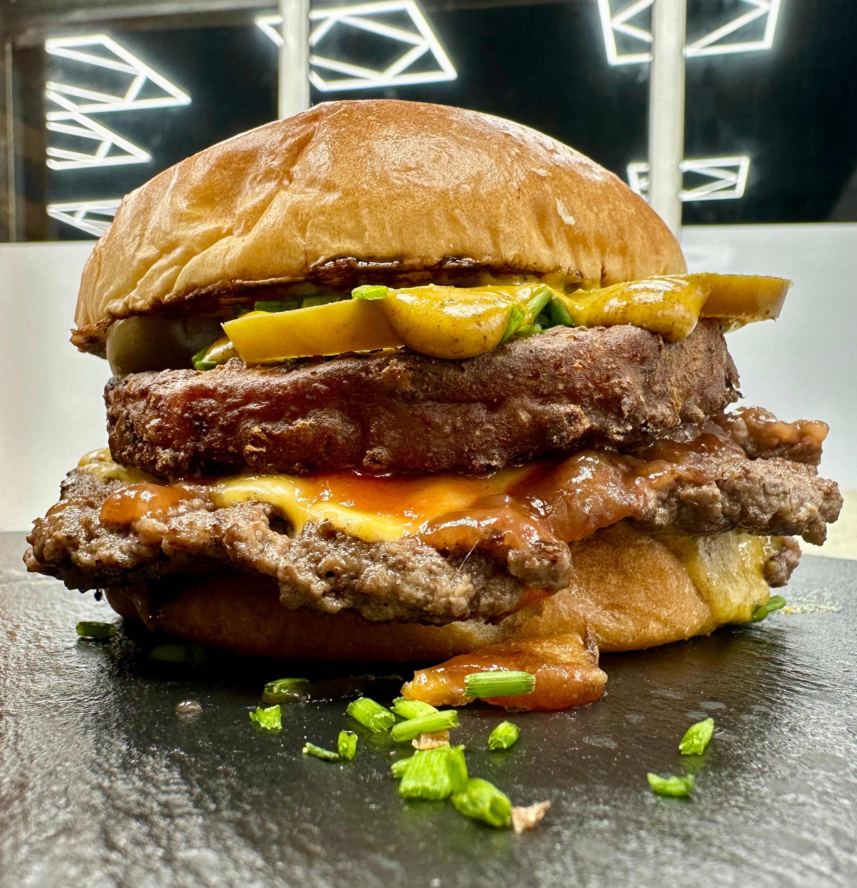 2 aged beef patties, ketchup, mustard, turkey rashers, dill pickles, and cheese in toasted brioche bun.£10.99