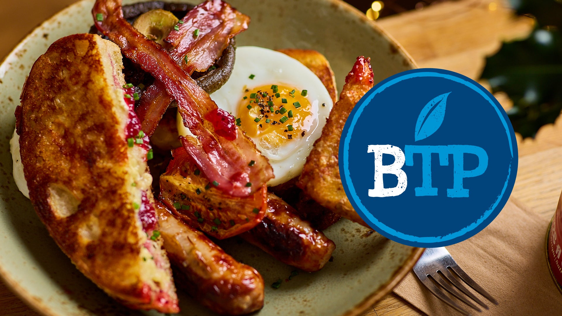 Boston’s biggest ever breakfast with a festive twist. A whole brie and cranberry sourdough toastie, topped with two Old English sausages, streaky bacon, fried eggs, homemade hash browns, roasted flat mushroom, slow-roasted tomato, cranberry sauceMay contain due to environment during production:NutsSoya1692 kcal