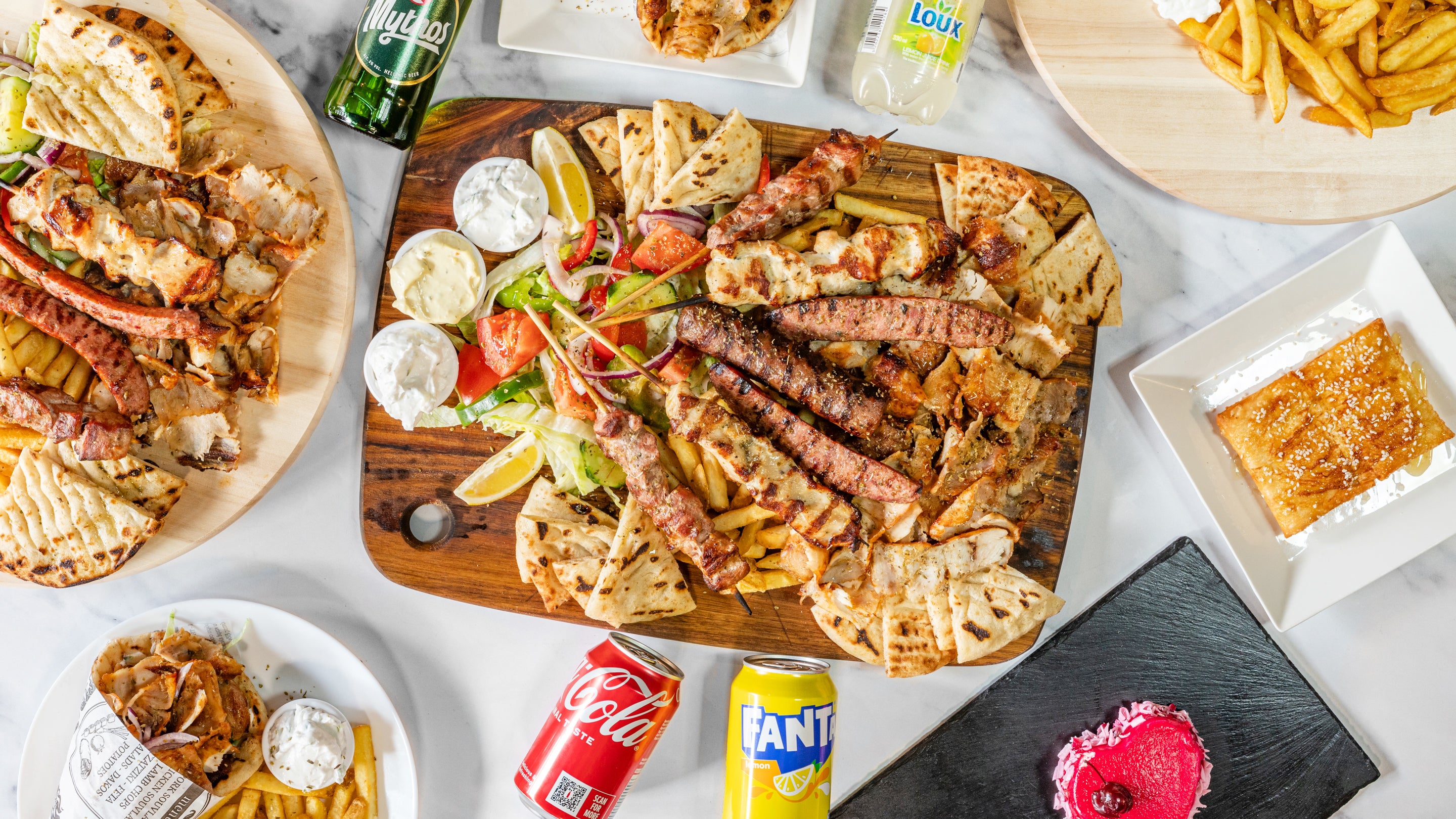 Served with gyros chicken or pork, 2 chicken skewer, 2 pork skewer, 1 sausage 1 lamb and beef kebab, 2 pitta bread, chips and side salad. Also your choice of 2 drinks and three dips.£36.95