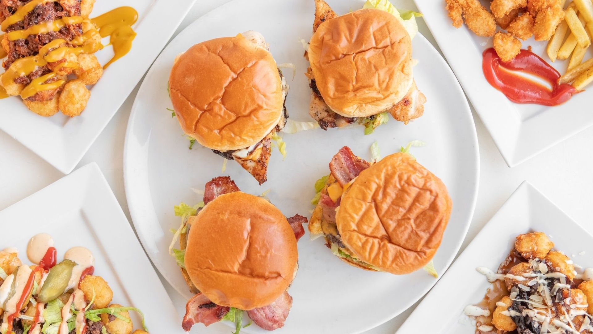 Crispy, creamy potato puffs with Parmesean, Onion Jam, Ranch Sauce£7.50Minced patty, Pickles, Lettuce, Ketchup