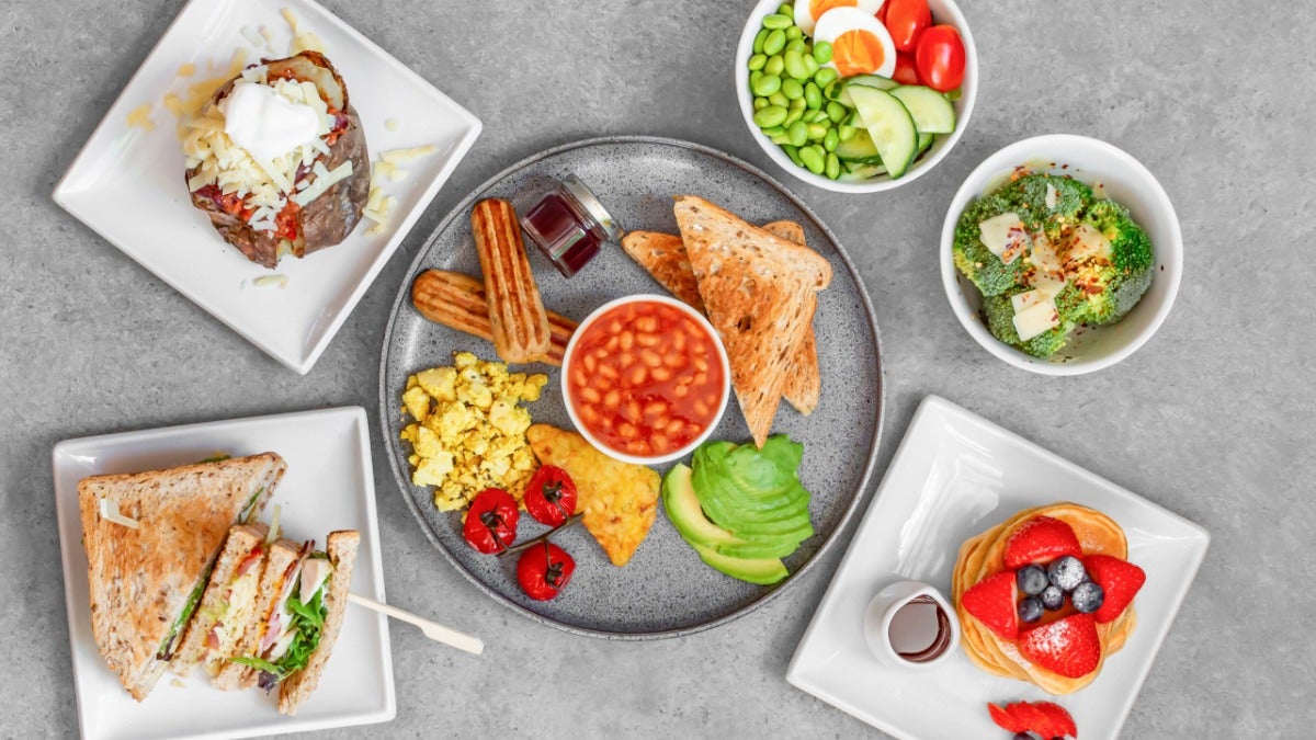 Vegan lincolnshire sausage, plant based bacon, scrambled tofu, beans, avocado, roasted vine tomatoes, hash brown and granary toast with vegan spread. Cal 728, Pro 35g, Carbs 77g (Sug 28g), Fat 28g (Sat 5g).573 kcal
