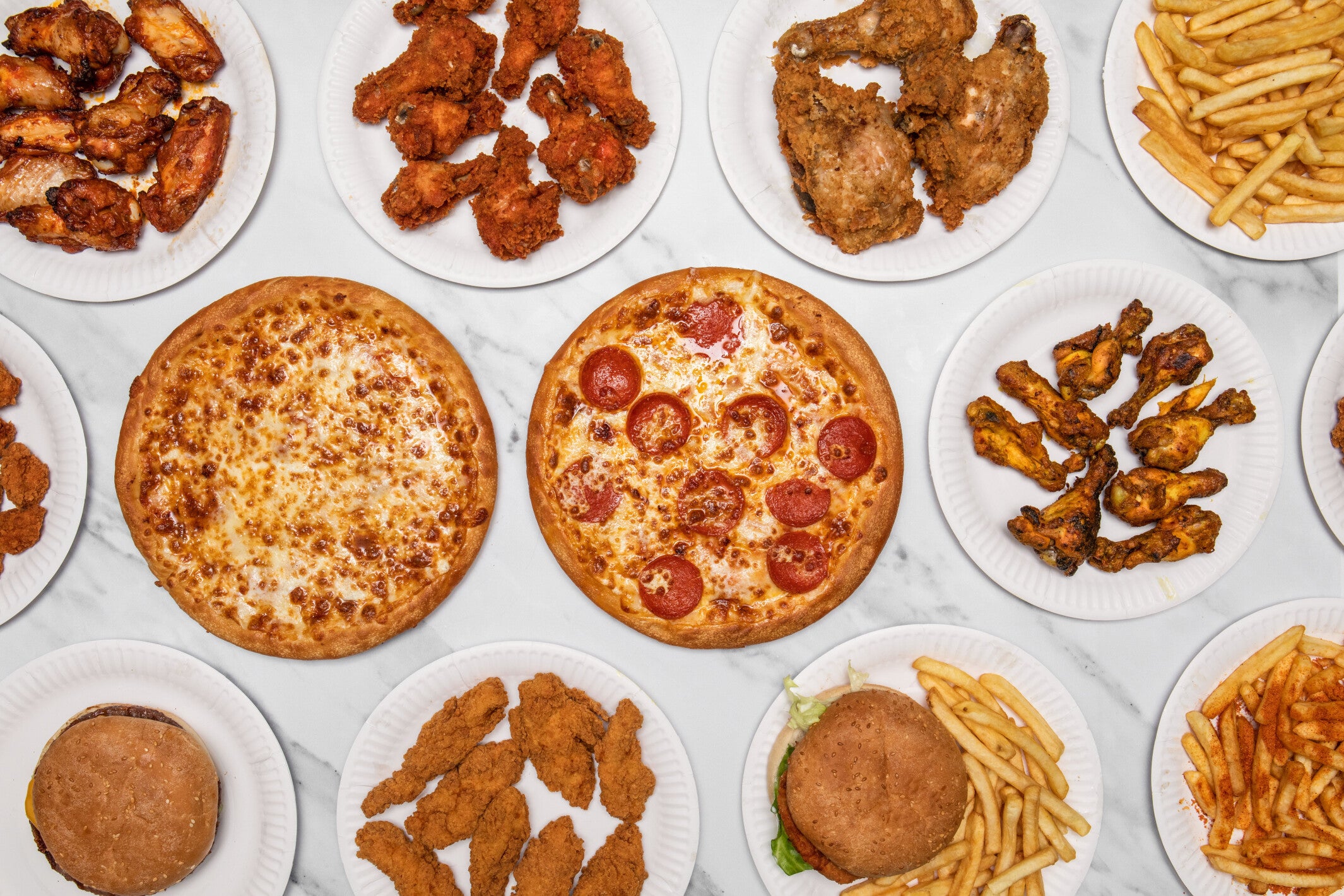 Any 2 x 12" pizza, 8pcs chicken, 8pcs hot wings, 3 x chips, 2 x beans and bottle of drink.£33.99