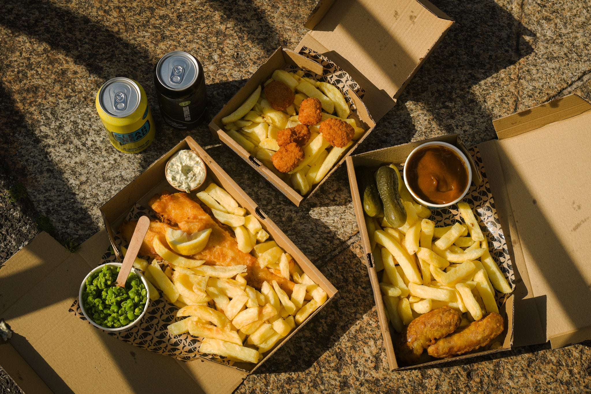2 x Small Cod with chips, 2 x Kids meals, 2 x Crushed Garden peas, 1 x Curry sauce, 2 x soft drinks, 2 kids cartons£49.95