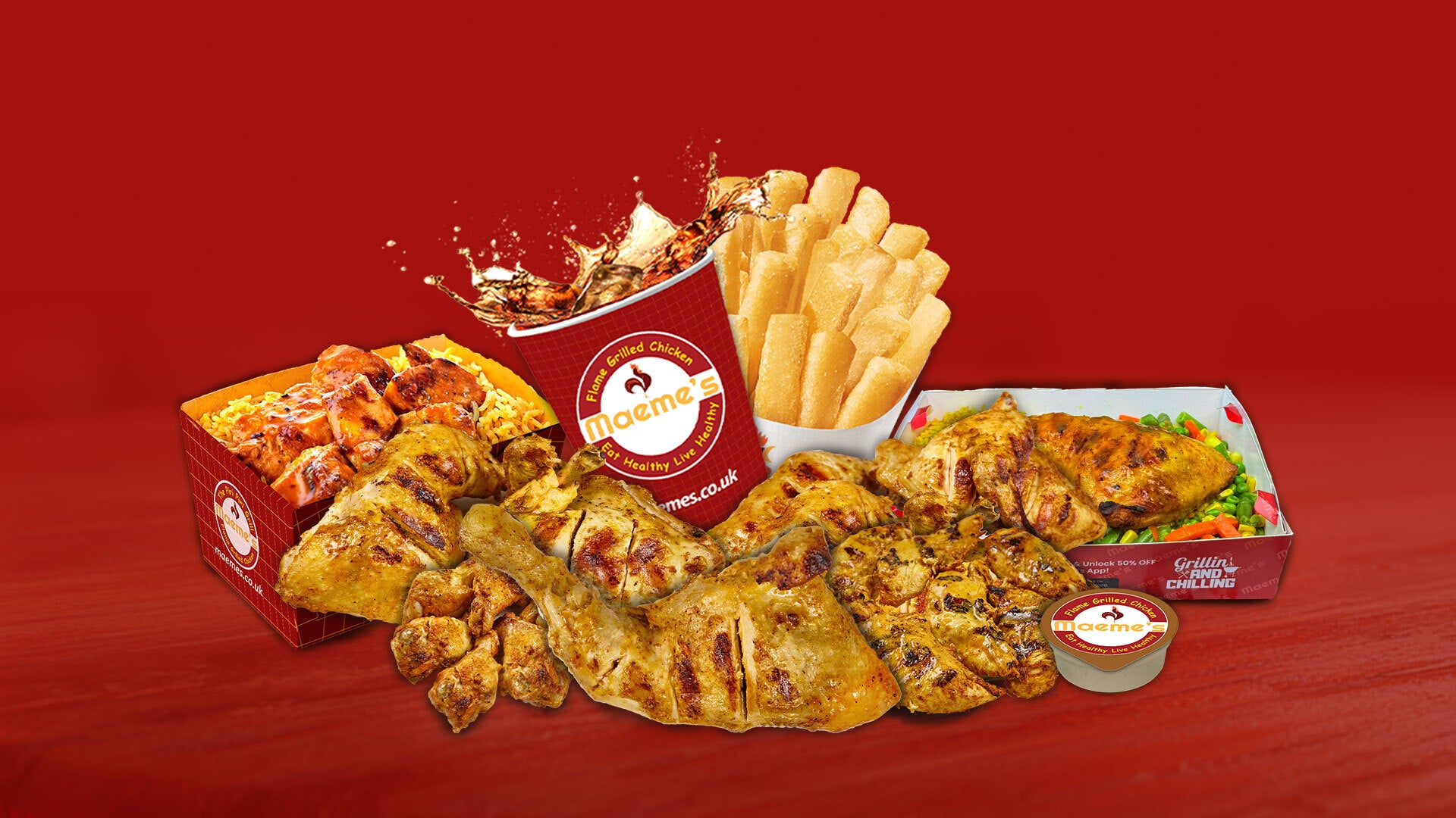 A Whole Chicken cooked to your choice of Maeme’s Flavours meal with regular fries, choice of regular drink & choice of dip.£18.79Maeme's 5 x Grilled Wings Meal