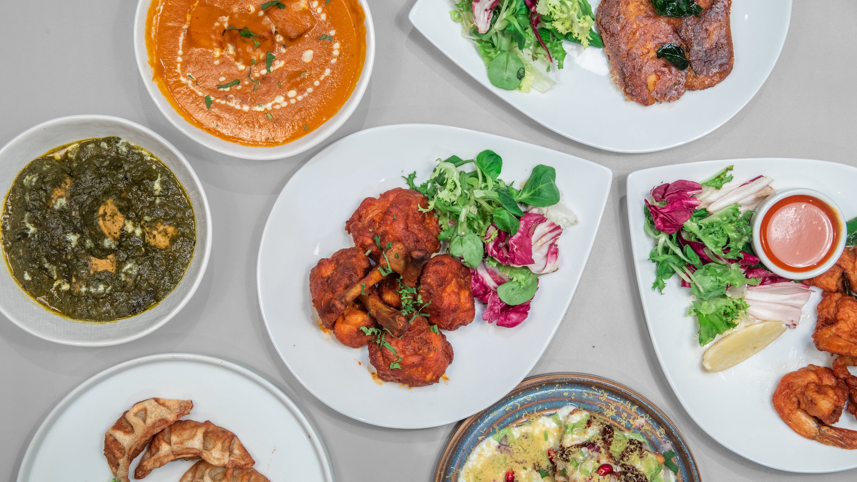 Tiger prawns marinated with kashmiri chillis, garlic and deep fried. Med£7.50Samaosa Ragada Chaat