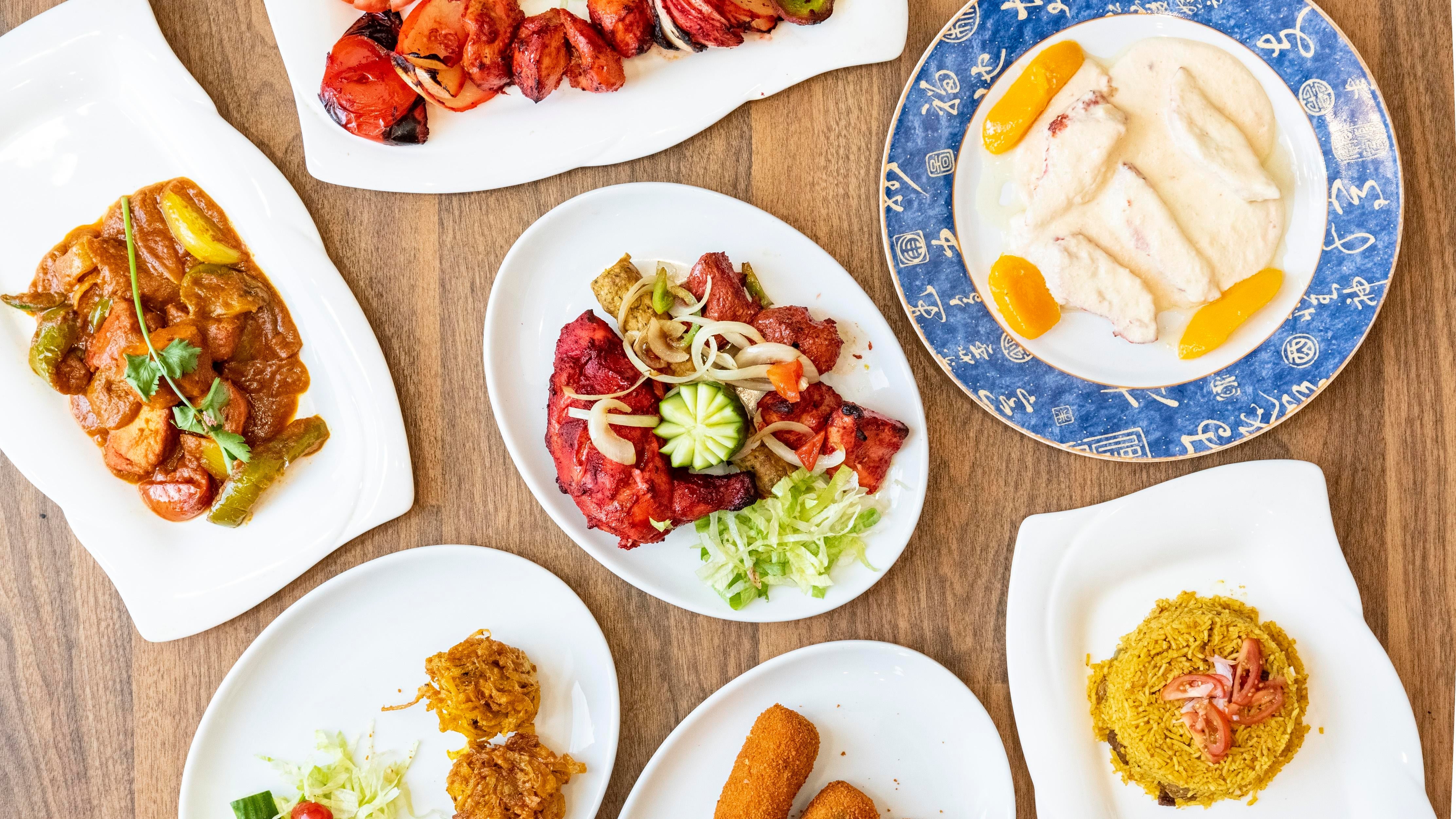 Poppadoms, onion bhaji ,vegetable samosa, saag aloo, mushroom bhaji, sabzi bhaji, plain paratha£19.95
