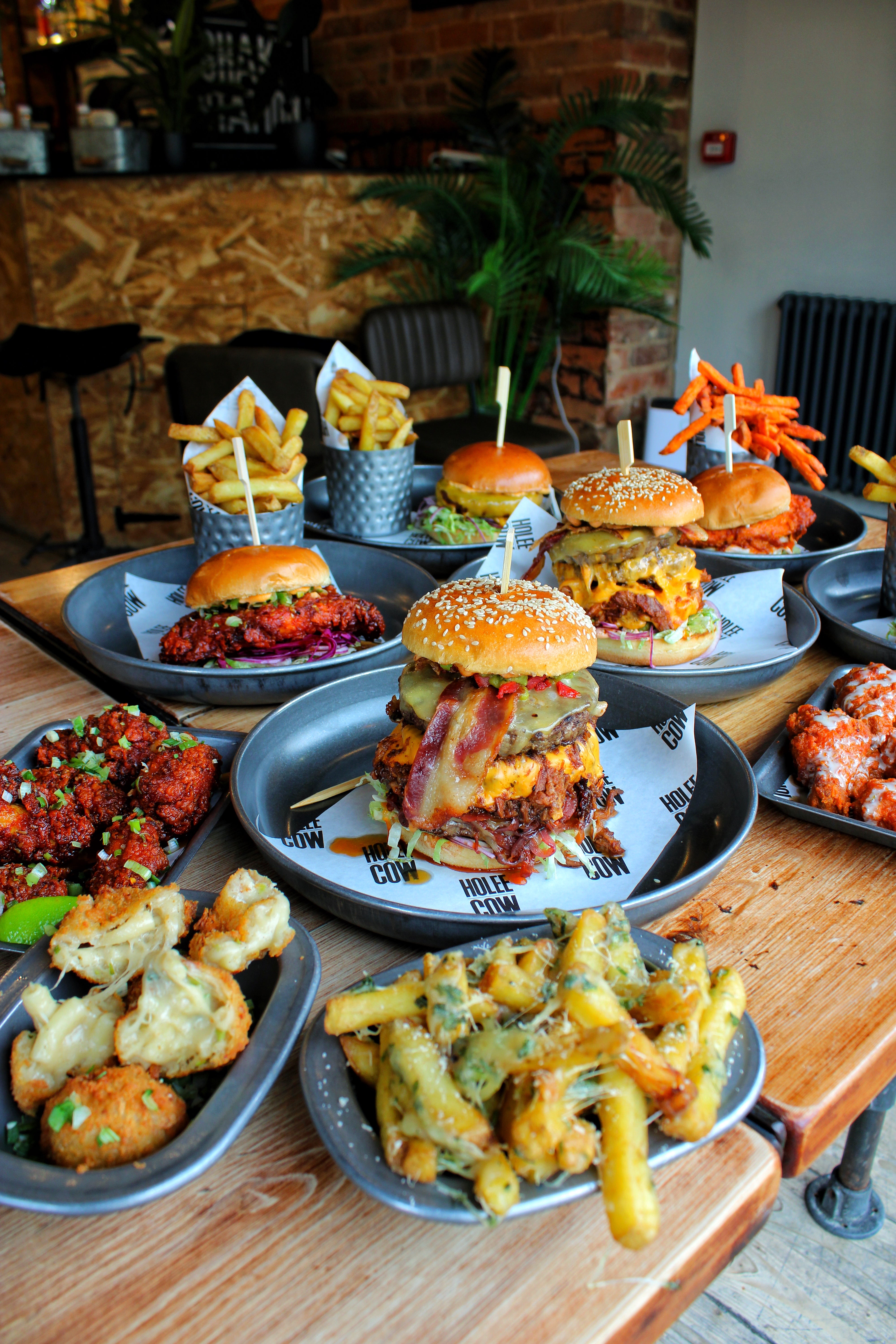 All of our Holee Cow burgers are made with free-roam South West Gloucestershire dry-aged longhorn beef, minced daily, then served in a fresh brioche bun and topped with sauces made in-house. Our Holee Cowless victoriously vegan burgers are made with Moving Mountains Plant based patty's or falafel made in house with our homemade sauces in freshly toasted vegan buns!