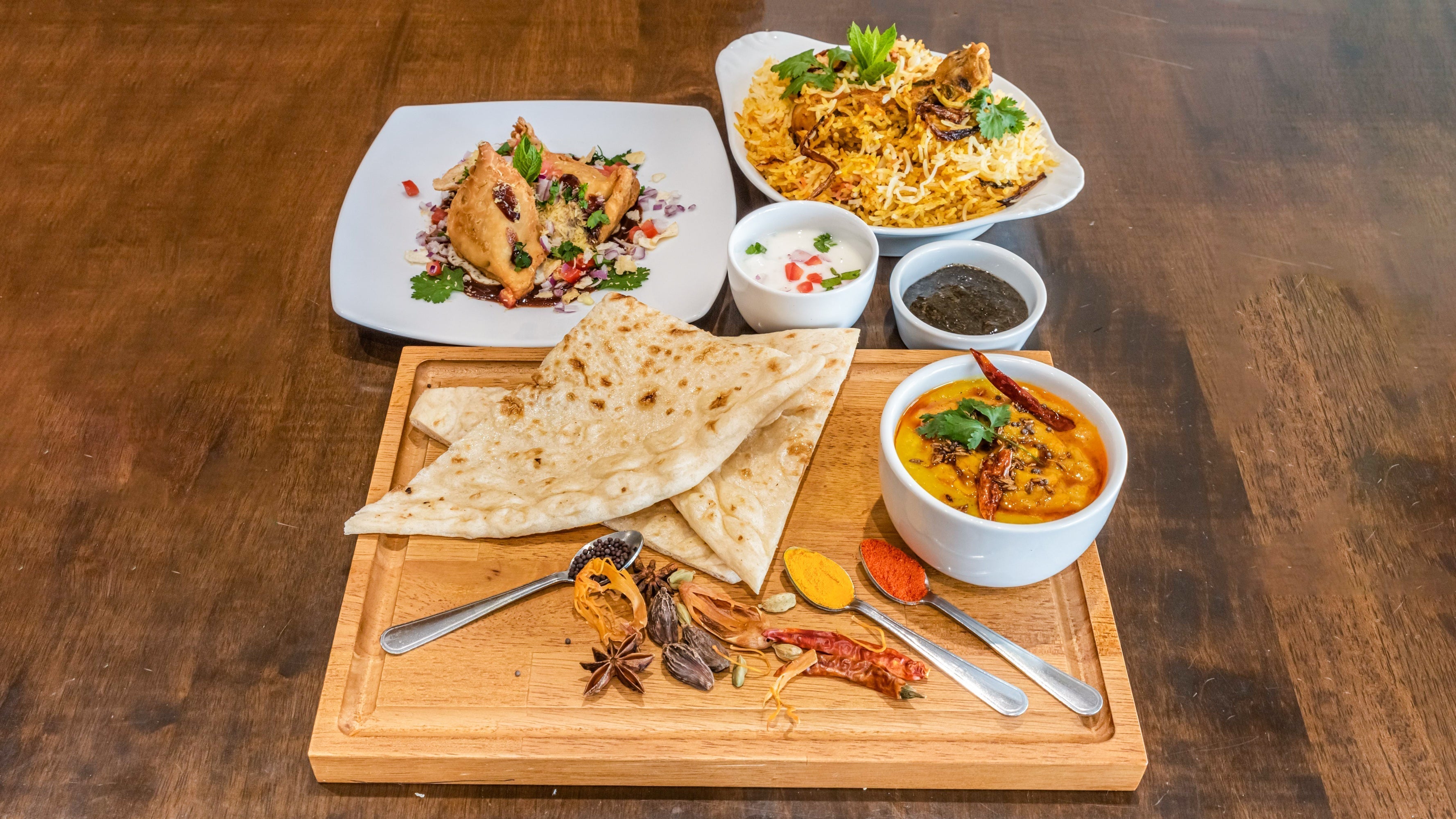 Smashed potatoes fried in spices, crispy on the outside with chick peas, curry and some onions£6.00Samosa Chat