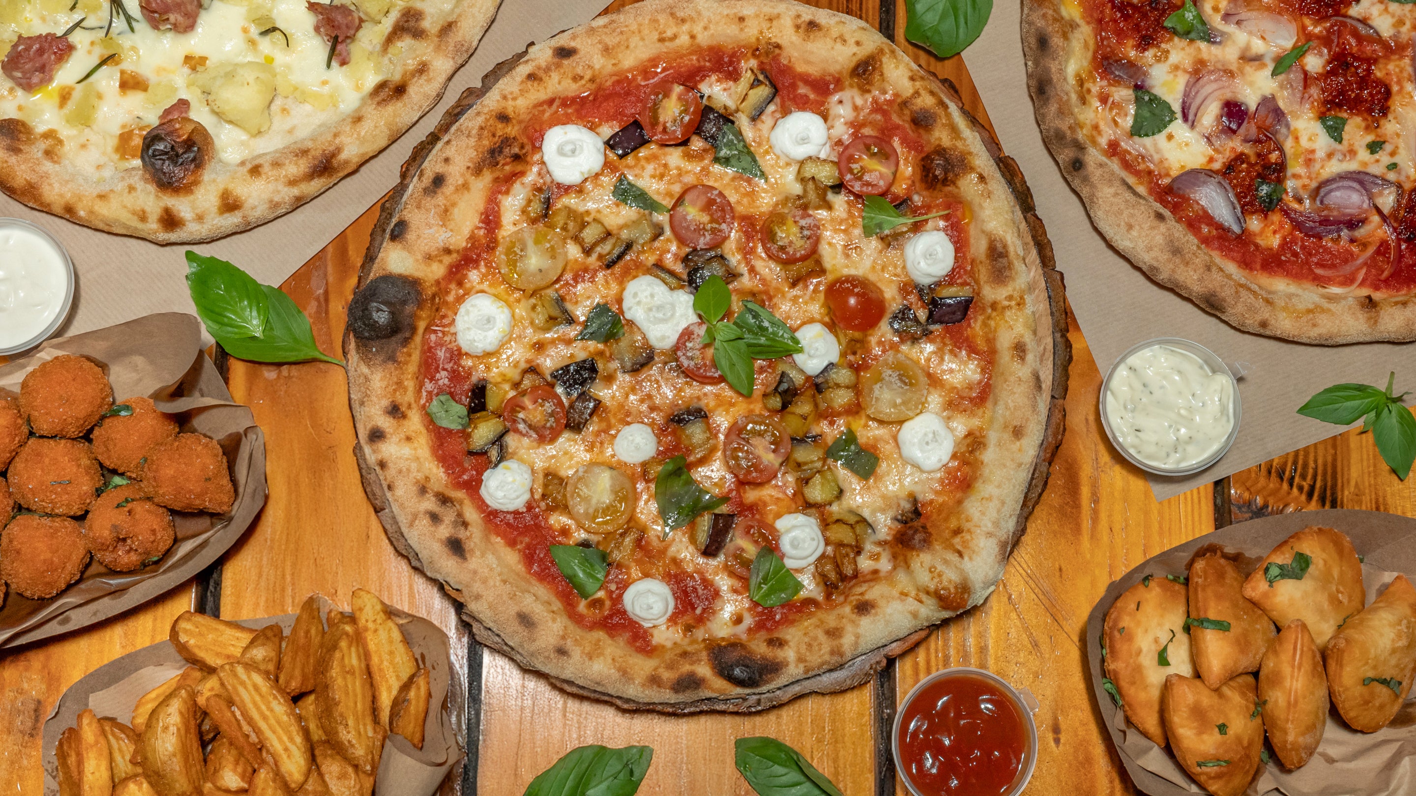 Nonna sauce, pepperoni, spicy nduja, topped with fresh rocket, 'Burrata'£14.95Melanzana di Capra (Vegetarian)