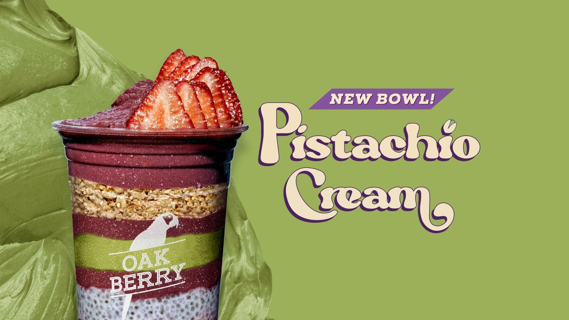 100% natural Acai layered with strawberries, blueberries, fit granola, chia pudding and cacao nibs.OAKBERRY Acai is Organic certified, Gluten Free with no food colourings. Sustainably sourced straight from the Brazilian Amazon to you!£13.10VeganPistachio Cream Bowl