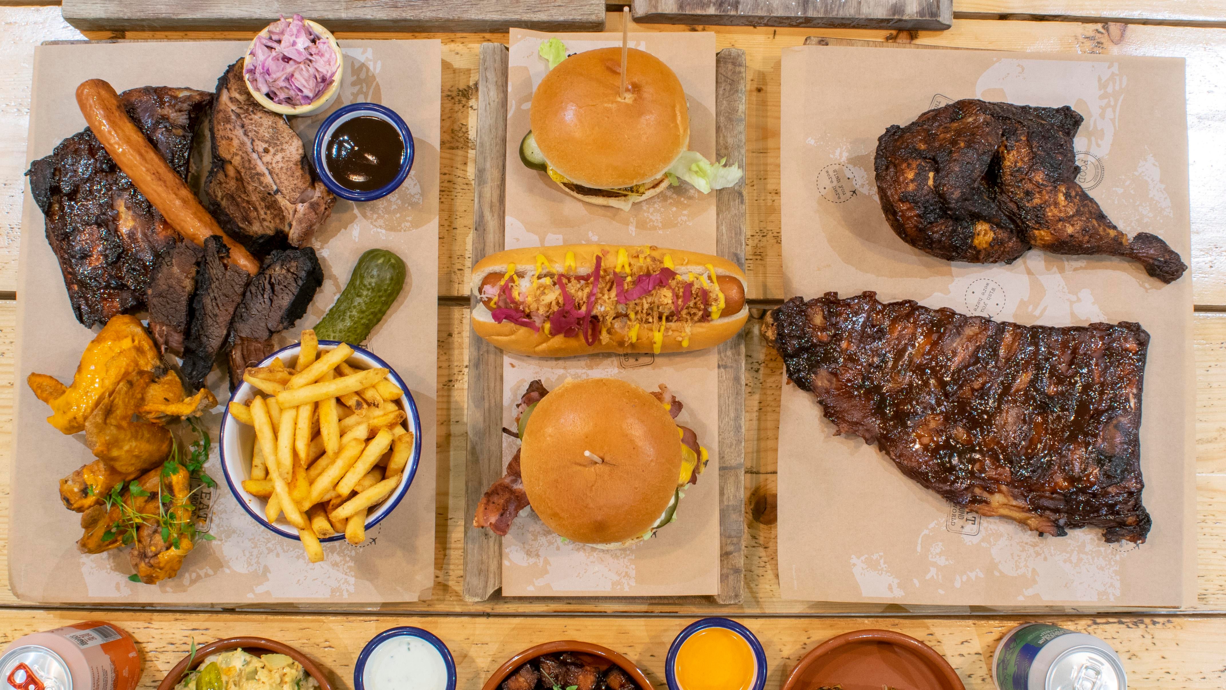 Baby Back Ribs, Smoked Brisket, Buttermilk fried chicken, BBQ pork belly burnt ends, home smoked kielbasa sausage, rustic fries, slaw, charred corn, pickle, Dipping Gravy£45.00The Smoked Burger