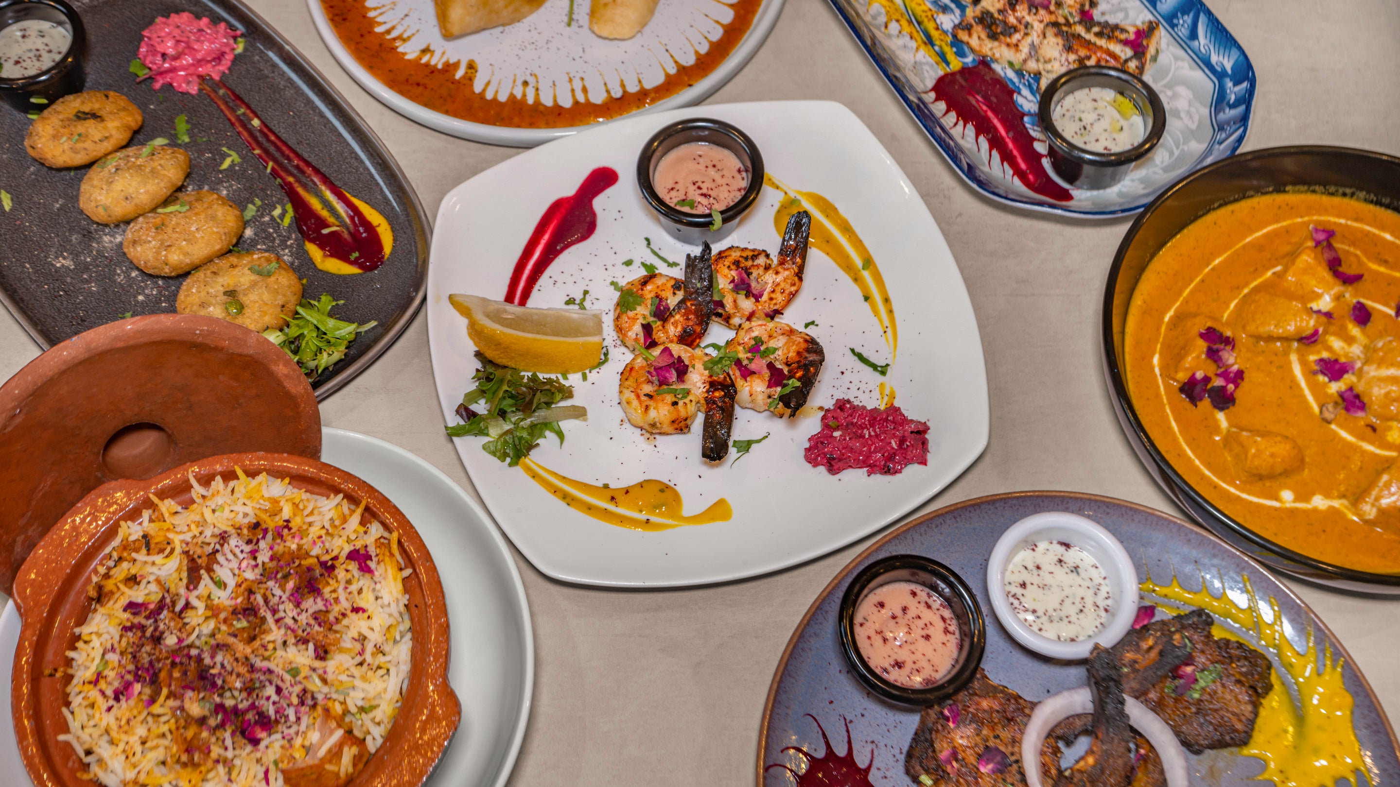 A selection to share — Chatpatta Wings, Chicken Pakora, Paneer Kathi Roll, Galotti Aloo & Vegetable Pakora.£29.00The Chef’s Grill