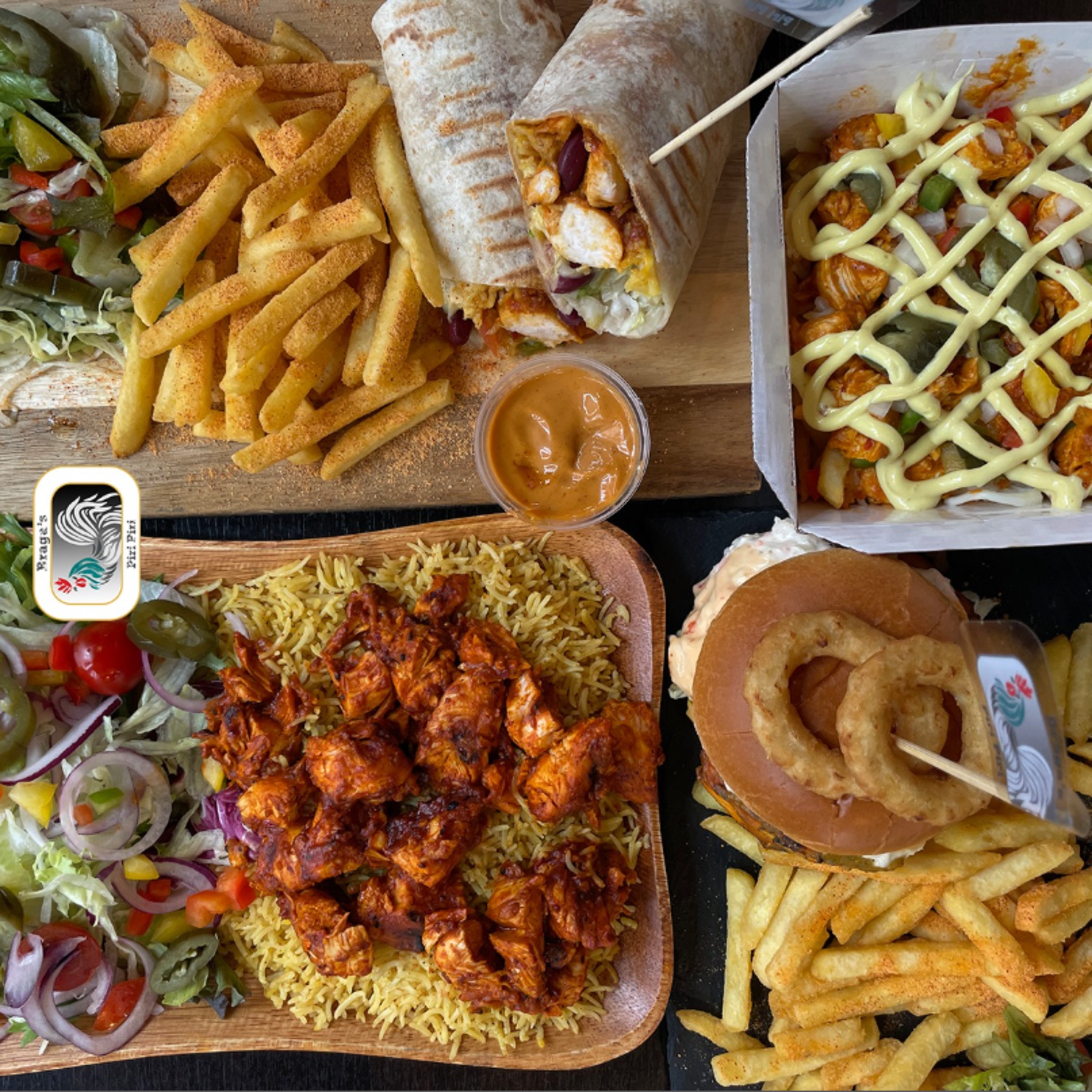 Piri Piri chicken wrap, 1 Wing, 2 strips with salad, dip and fries or rice.£13.95Chicken Breast Fillets