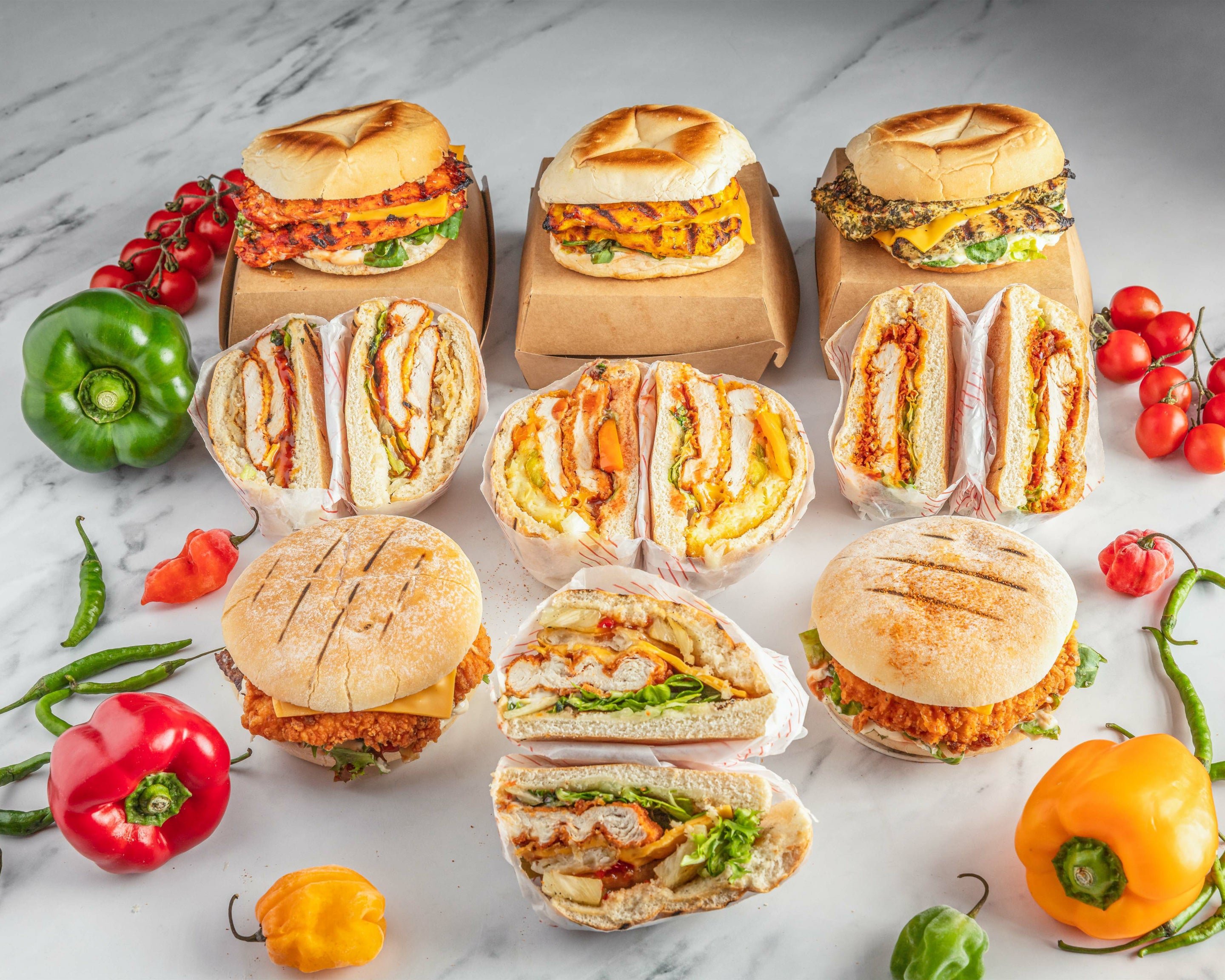 Sizzler fillet, pineapple, onion rings, jalepino, ghekin, cheese, sweet chilli, hot sauce, may, salad.