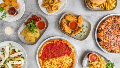 Any 3x 9" Pizzas, 2x Chips, 1 Strips (4pcs), 2x Fruit Shoots, 1 Soft Drink (Large).£28.00Pizza Deal 6