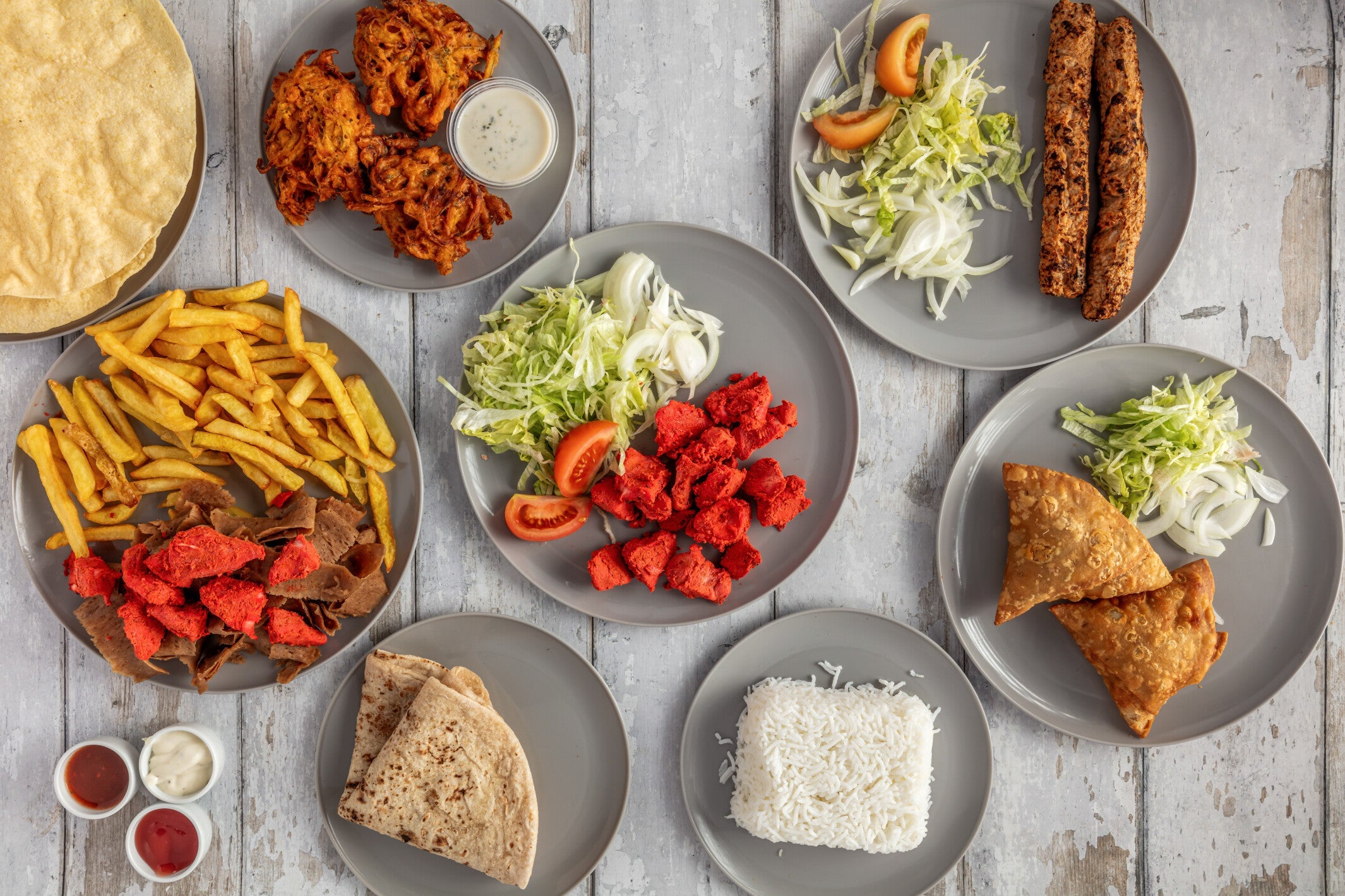 Served with warm pitta bread fresh salad and sauces.
