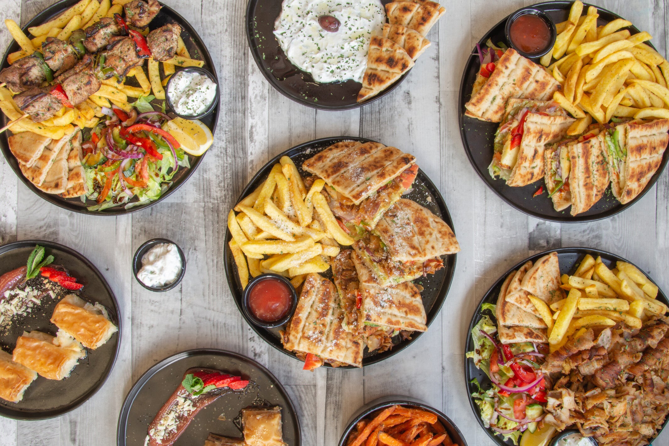 Pork gyros,two pieces of chicken souvlaki, lamb kebab and lamb chops served with pitta bread, chips, tzatziki and mixed salad.£42.95Pork Souvlaki plated
