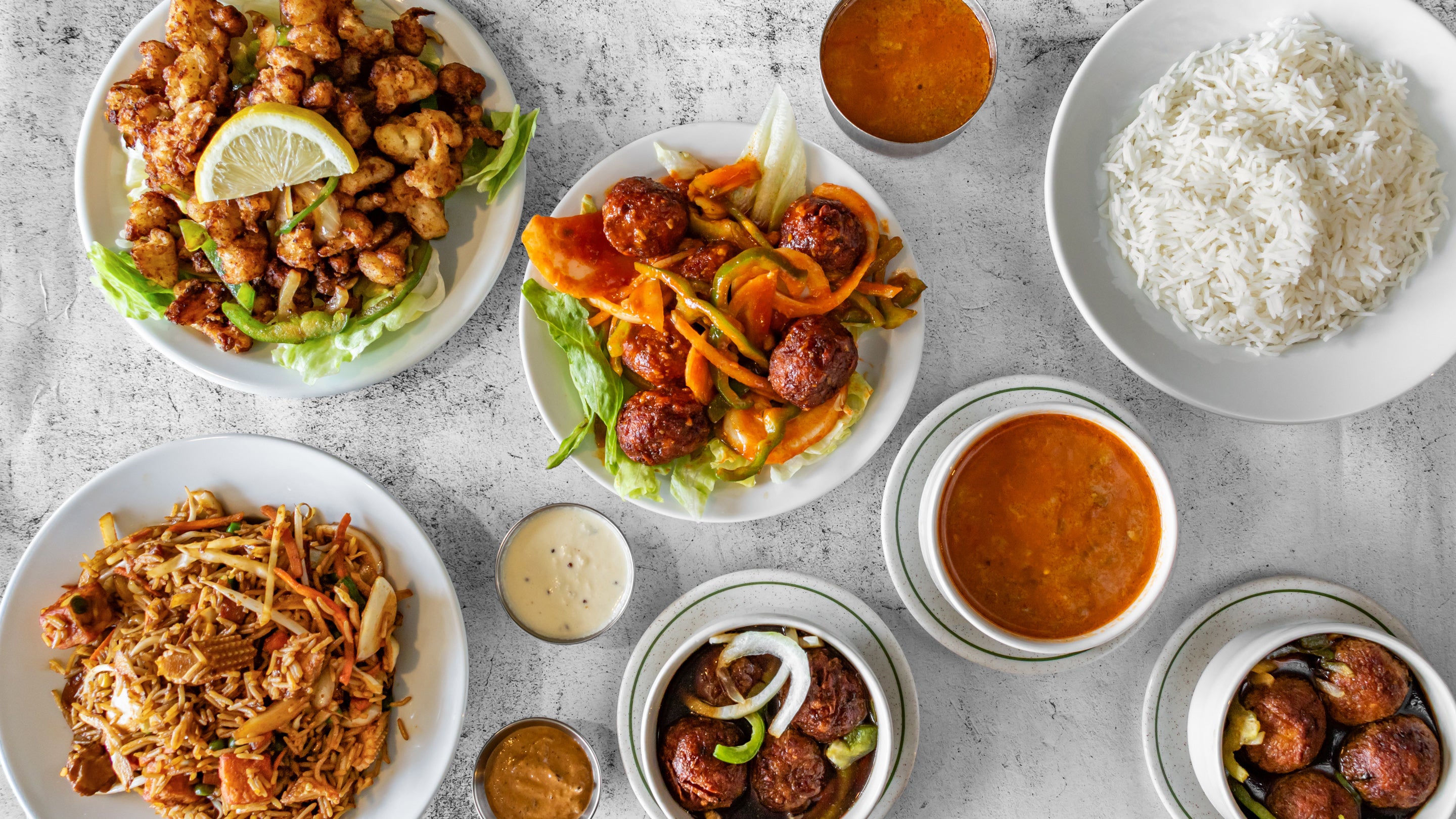 Layers of Schezwan Noodles and Fried Rice Topped With Mixed Vegetable Schezwan Curry. (VGA)£16.50