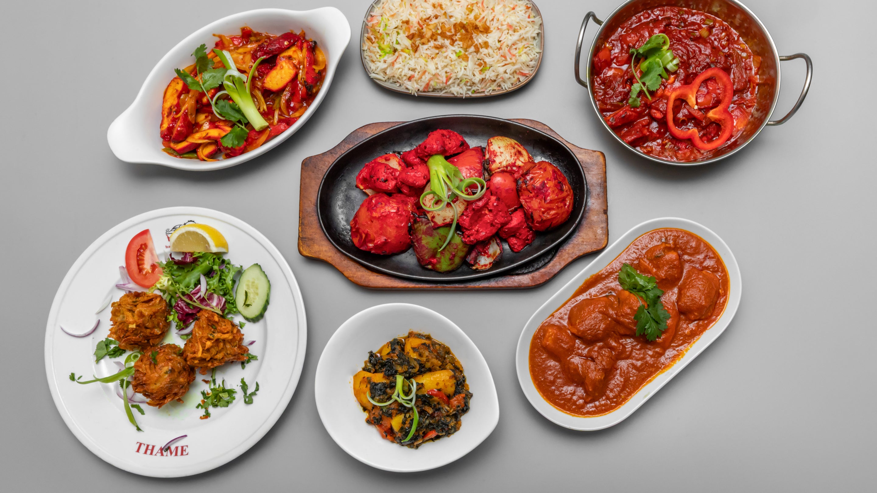 Poppadoms & Condiments, Onion Bhajis & Chicken Tikka starters, Chicken Tikka Masala & Lamb Bhoona, Bombay Aloo, Pilau Rice & Plain Naan£30.95