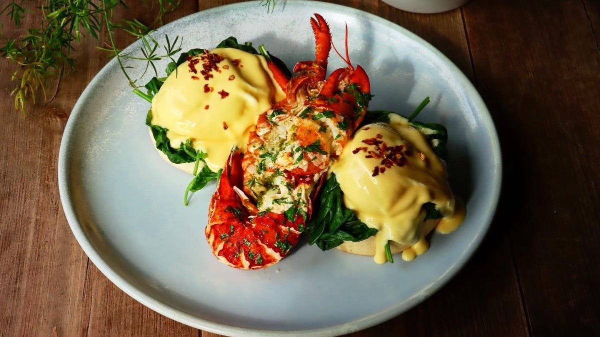 Smoked salmon, poached free-range eggs, pink hollandaise, and toasted organic English muffin£13.65Lobster Eggs