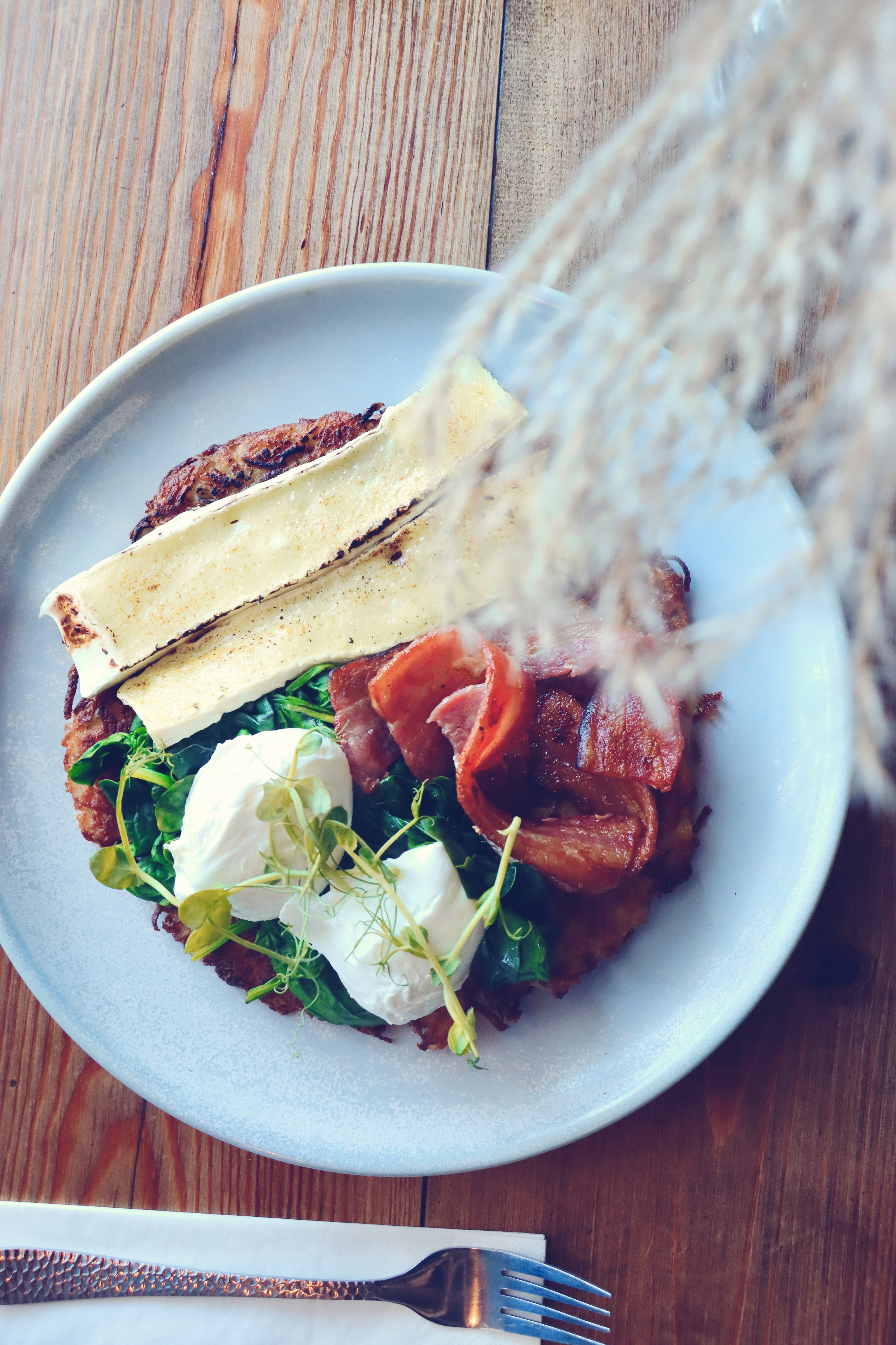 Crispy streaky bacon, poached free-range eggs, hollandaise, and toasted organic English muffin£13.70