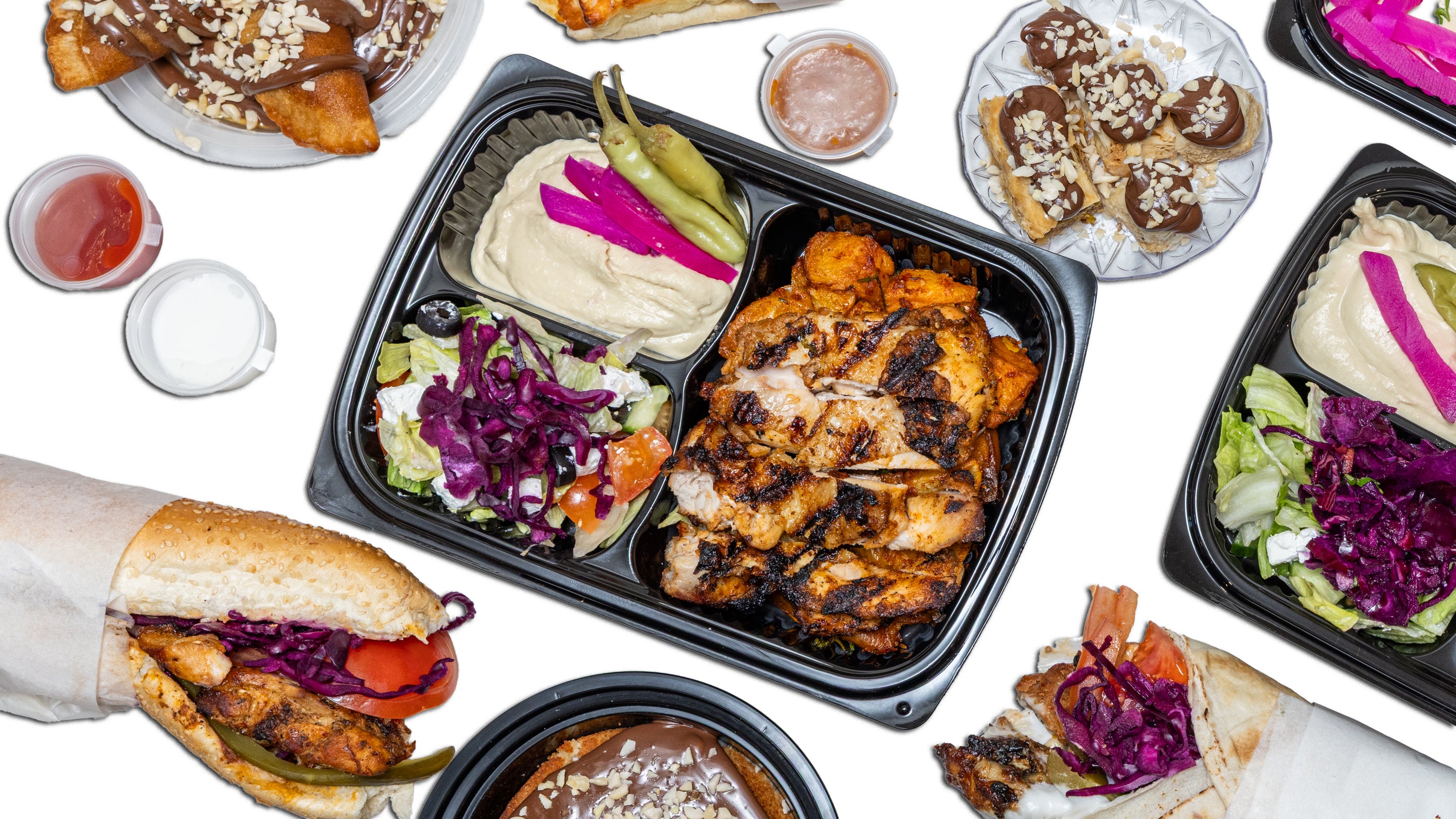 Skewer of grilled chicken meat kofta and chicken shawarma on bed of spiced roasted potato greek salad and sababa cabbage salad served with hoummous£17.99HalalFamous Chicken Shawarma