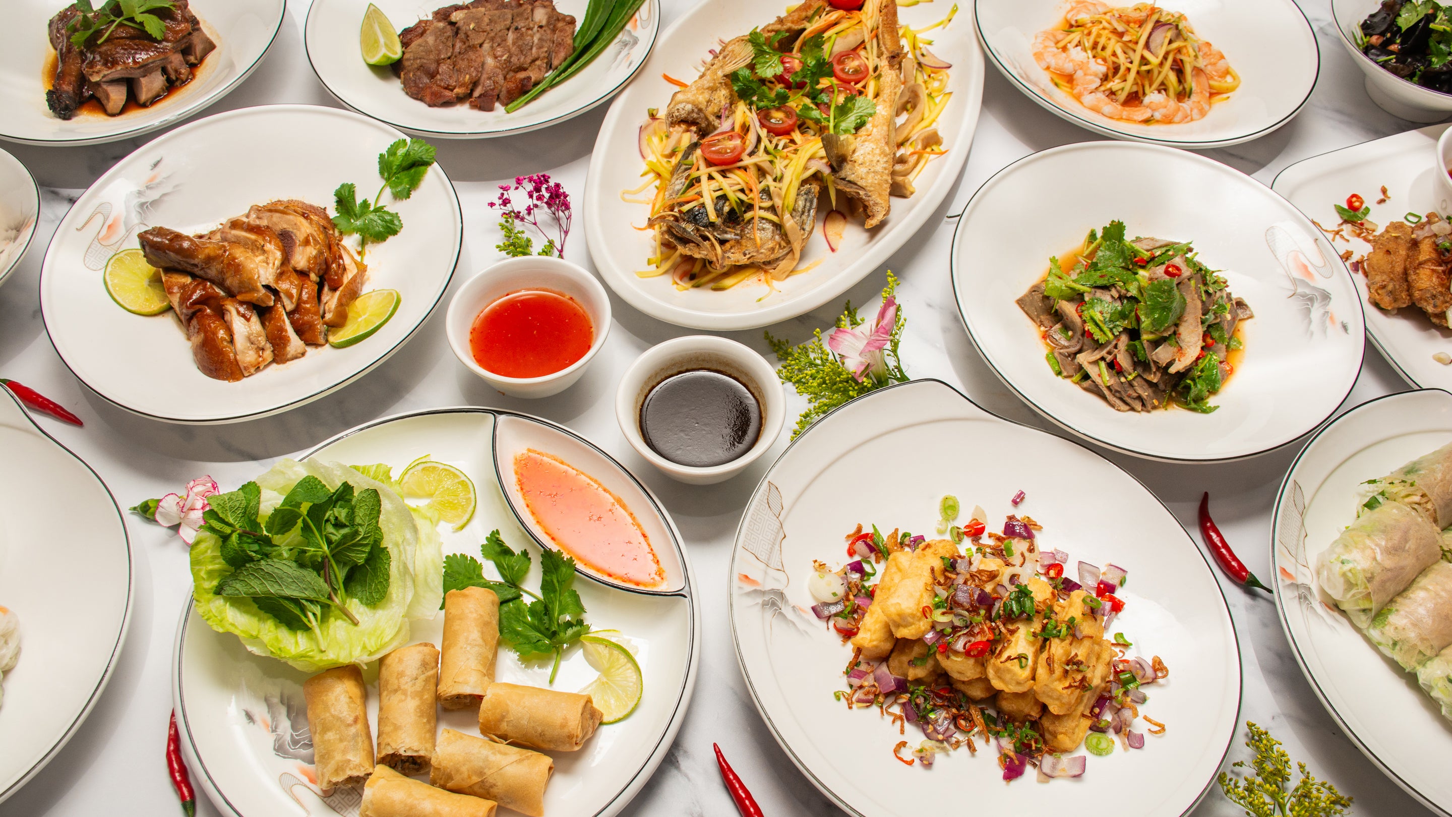 Fresh rice paper rolls filled with pork, shredded pork skin, roasted ground rice, fresh salad, and noodles served with sweet spicy fish sauce.£11.95