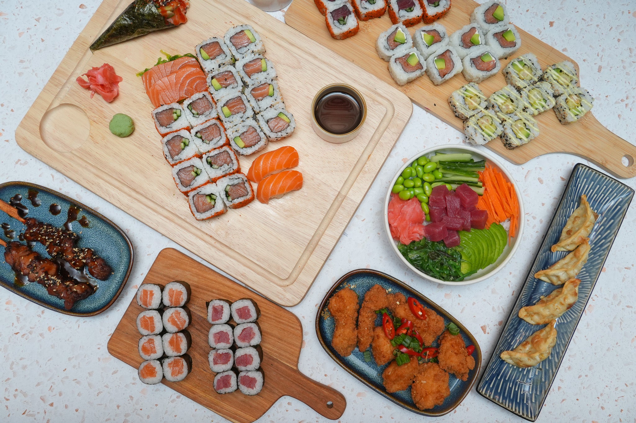 Indulge in our sushi set featuring 8 pieces each of cucumber Maki, carrot Maki, and avocado Maki. It's a fresh and delightful assortment perfect for any sushi enthusiast!