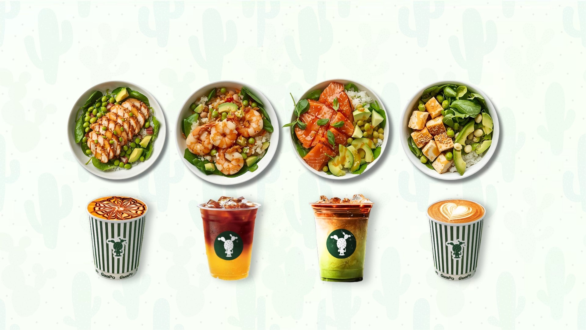 Flavored coffee drinks and classic coffee from GuaPo coffee. Fresh made protein salad from Glow bowl.