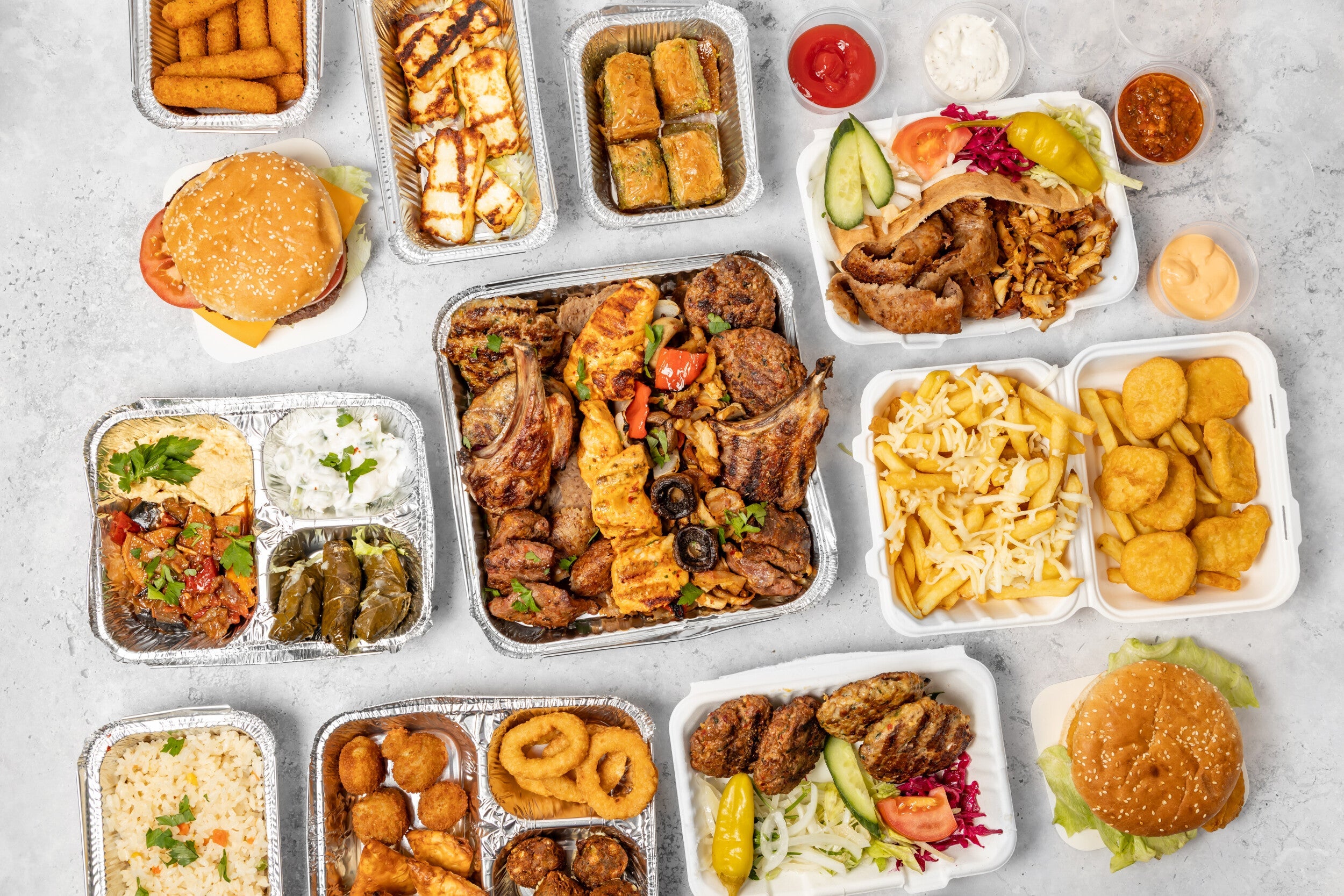 (4-6 Person)· 2 Skewers of Chicken Shish· 2 Skewers of Lamb Shish· 1 Lamb or Chicken Kofte. Slices of Mixed Doner. 2 Large Chips or Rice· 4 Pitta Bread. Cold Meze of Choice. 2 Boxes of Salad· 4 Pots of Sauce. Bottle of Drink£56.00Set 2