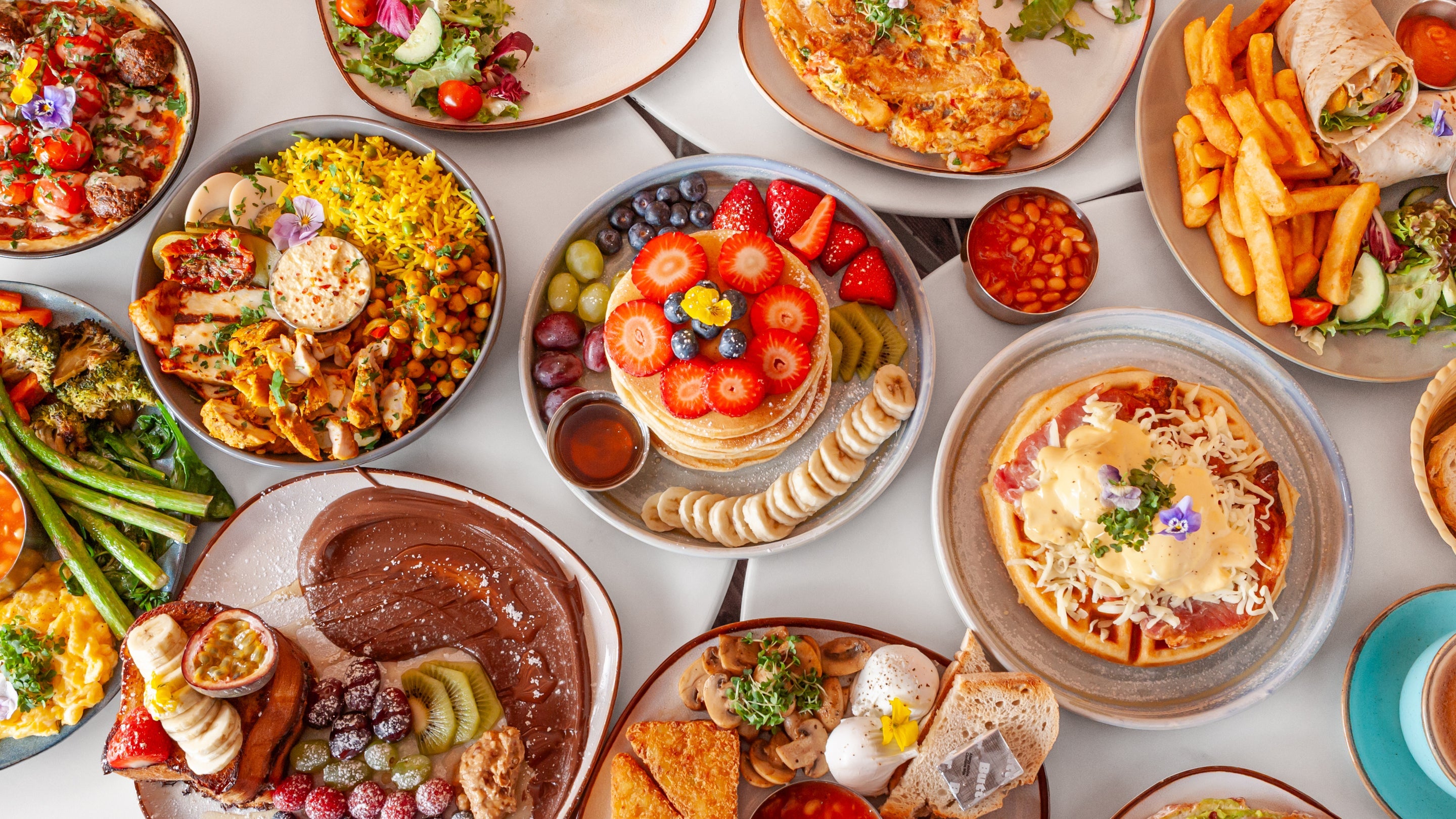 Sweet potato, shroomdog sausage, 2pcs hashbrown, grilled tomato, avocado, sautéed spinach, beans, served with sourdough or white toasts.£16.00Protein Pancake