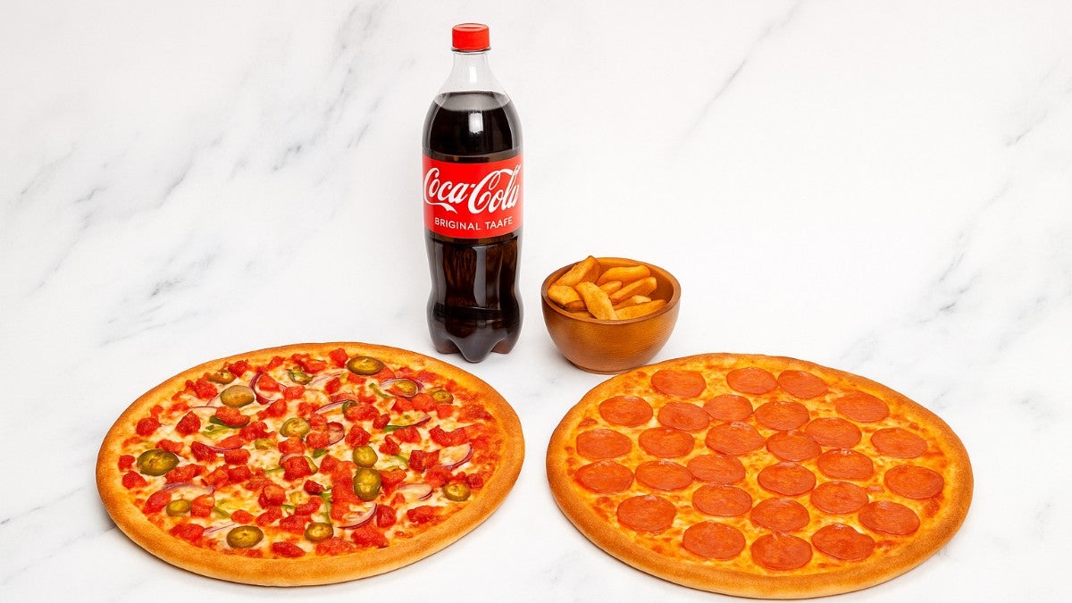 Two medium pizzas, each topped with delicious ingredients and melted cheese, perfect for sharing.Comes with 2 garlic dips£27.5820% off