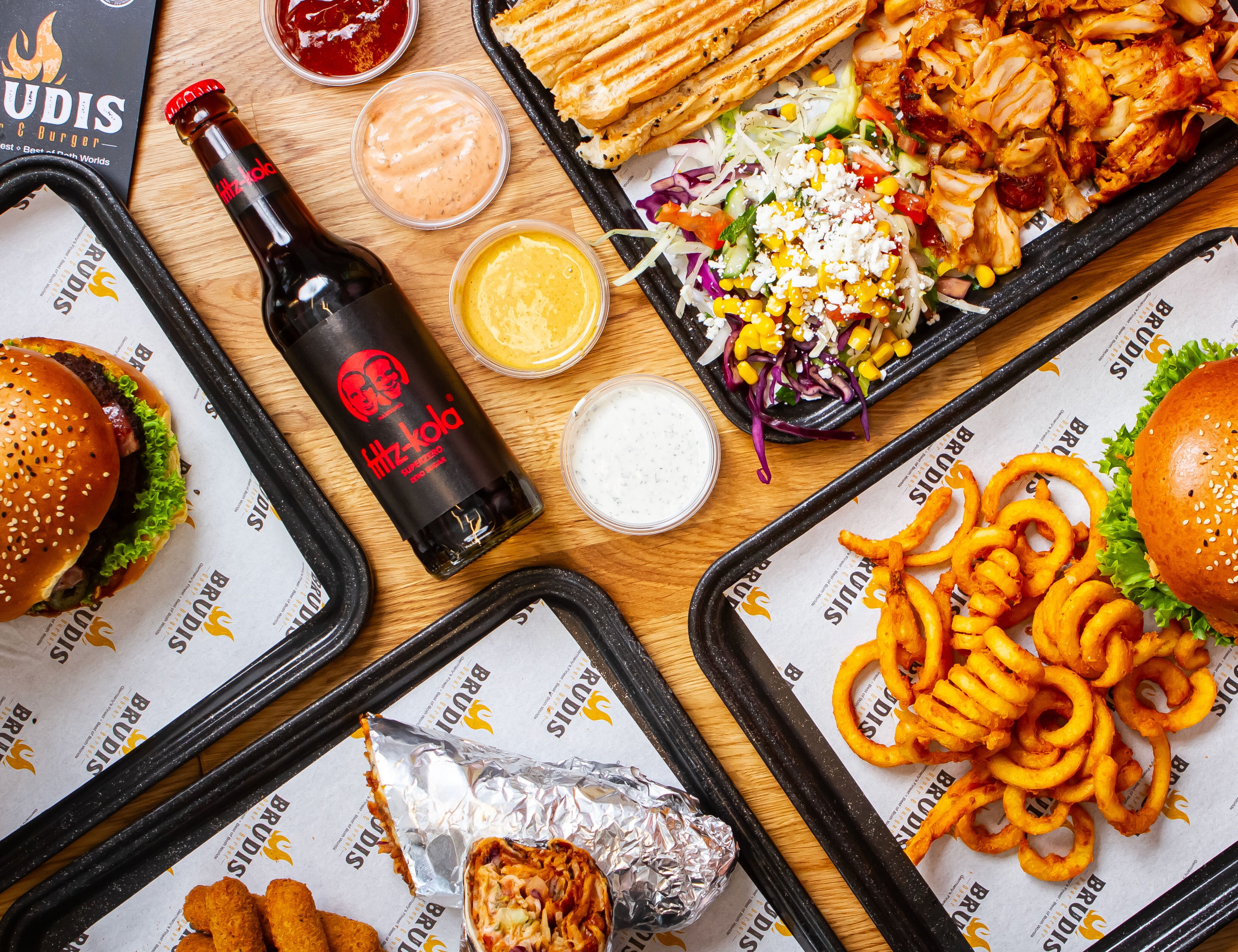 Freshly crafted beef patties, served in a brioche bun with fresh salad and Brudis signature sauces.