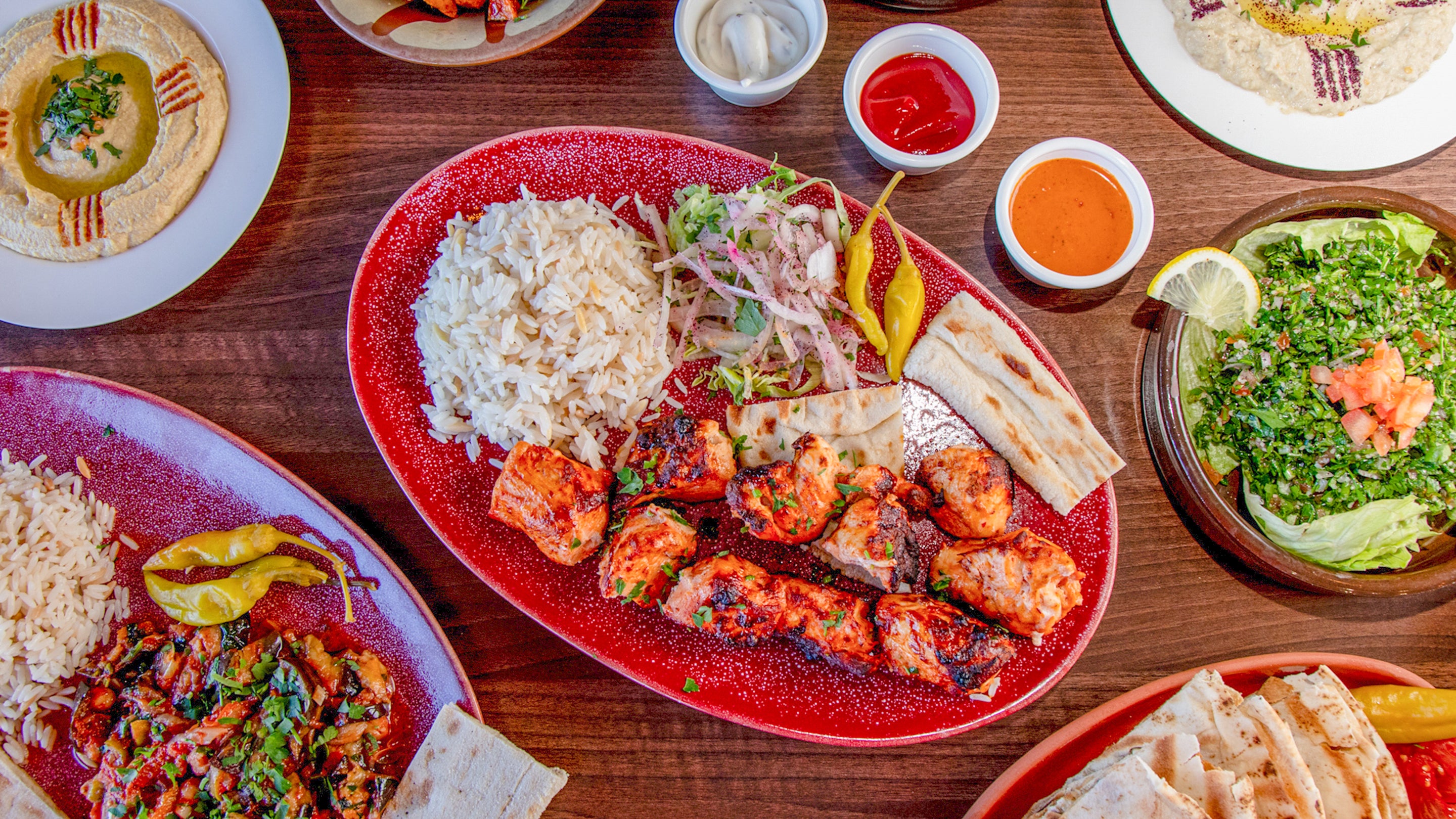 1 Chicken Shish + 1 Lamb Shish + 1 Lamb Kofta + 4 Chicken Wings + Chicken Shawarma + Choose any 2 Mezze. All served with salad, chips & rice.