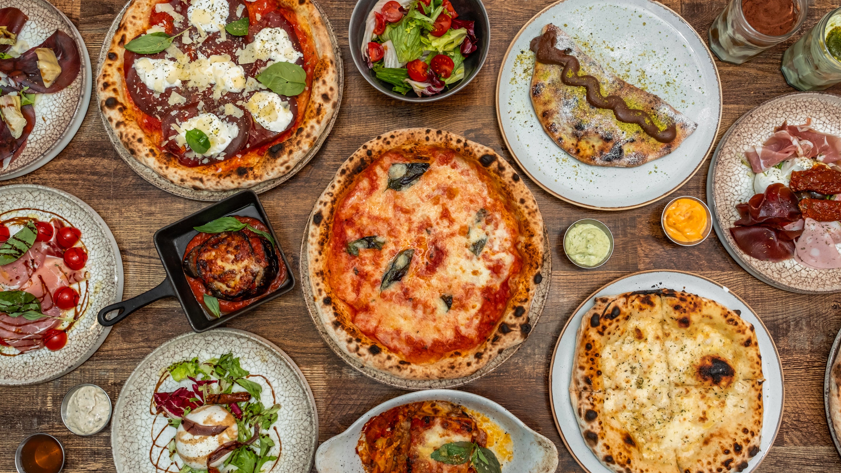 Tomato sauce, fresh basil, cool & creamy Stracciatella cream, topped with cool Bresaola Beef, and Parmigiana Reggiano£16.00