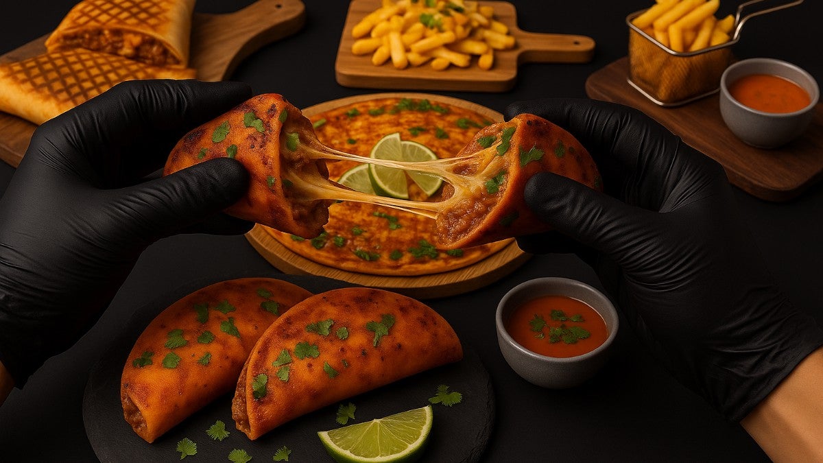 Traditional Mexican tortillas dipped in our famous birria stew topped up with mozzarella cheese, our slow cooked succulent meat (veg option available), coriander, onion and finished with a glaze of sriracha sauce.