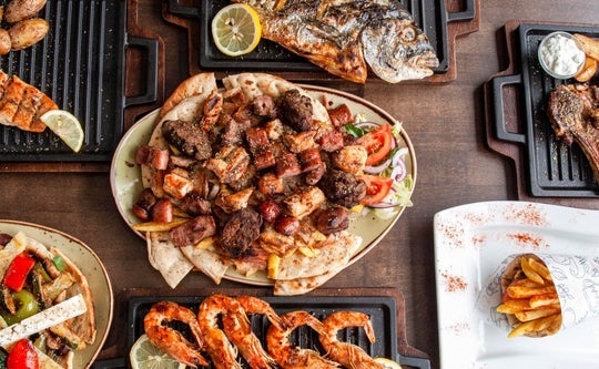 Meat platter with chicken and pork souvlaki, bifteki, pork and chicken gyros meat, pork sausage, onions, tomatoes, lettuce, chips, tzatziki sauce and pita breads.£52.95Vegetarian Mix Grill Sharing