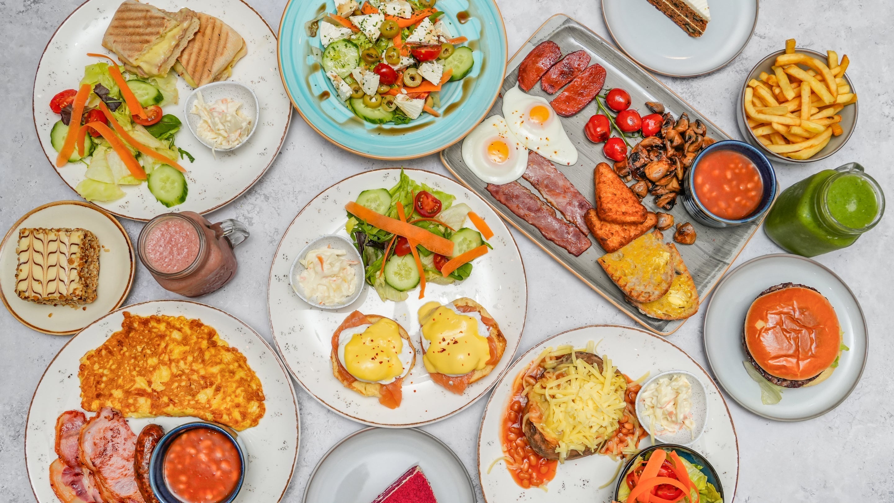 Highly rated· Two fried eggs, two slices of bacon, two Cumberland sausages, two hashbrowns, sauteed mushrooms, grilled cherry tomatoes, and a side of beans£18.90The Classic