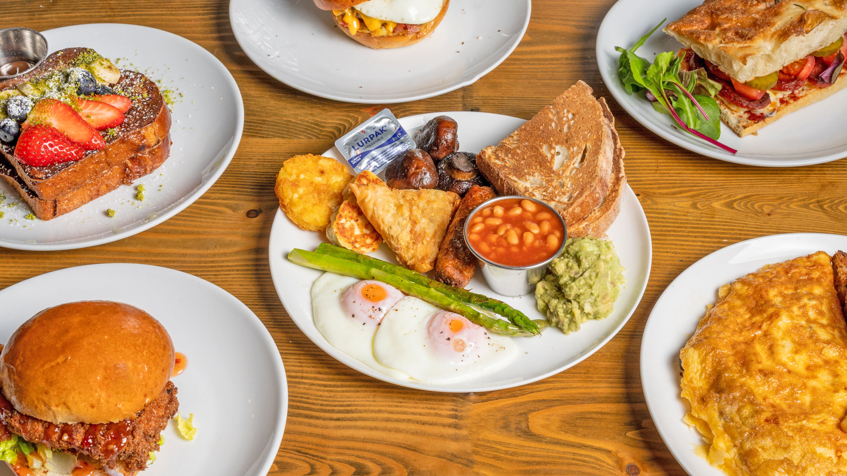 Poached eggs, asparagus, sweet potato, drizzledhollandaise on brioche with one topping£12.90