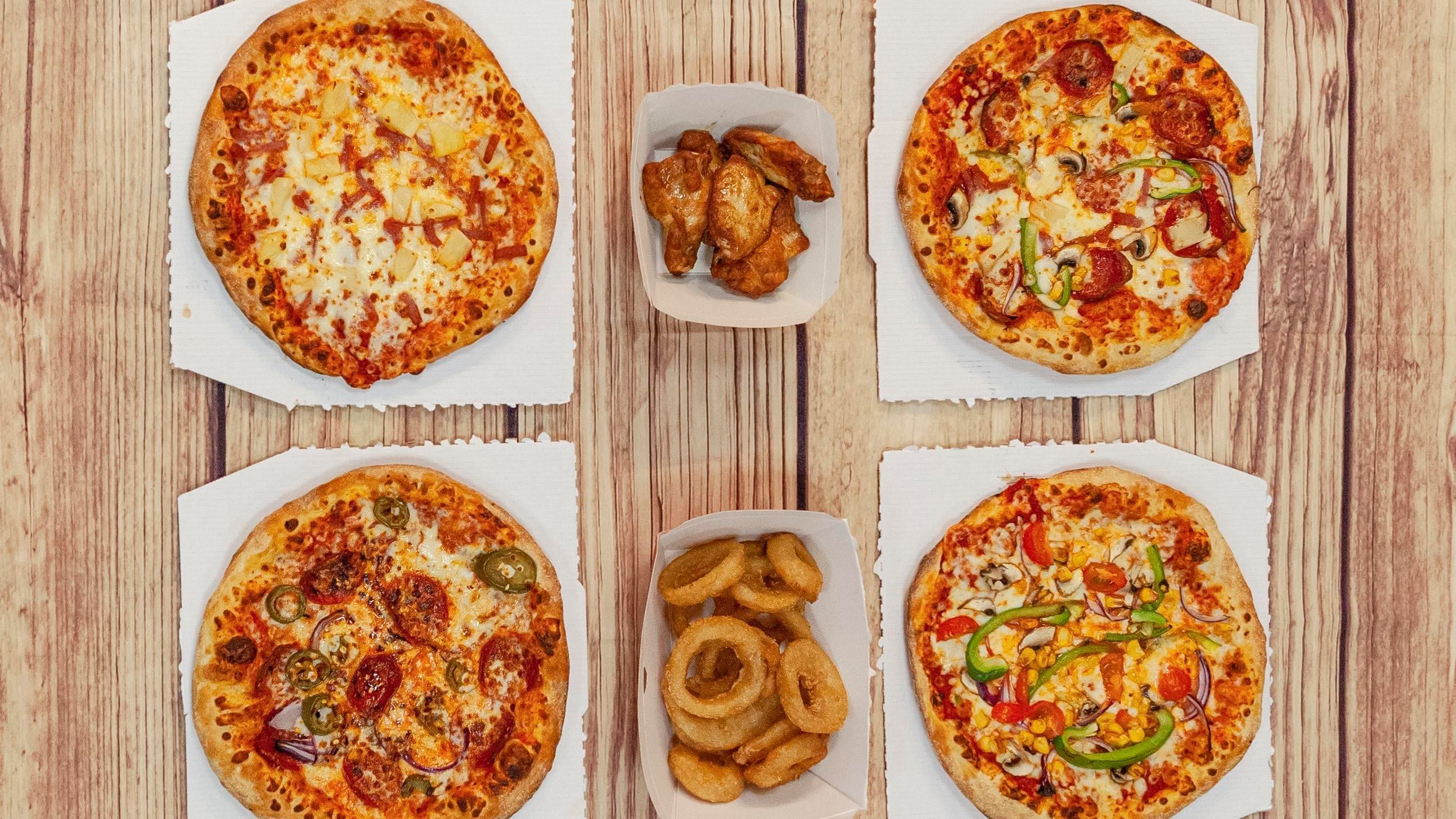 Any 15” PizzaChicken Madras, Lamb Jalfrazi, Chicken TikkaDansak, Bombay Aloo, Tarka DaalPilau Rice, 2 Nan1 Bottle of soft Drink£65.00