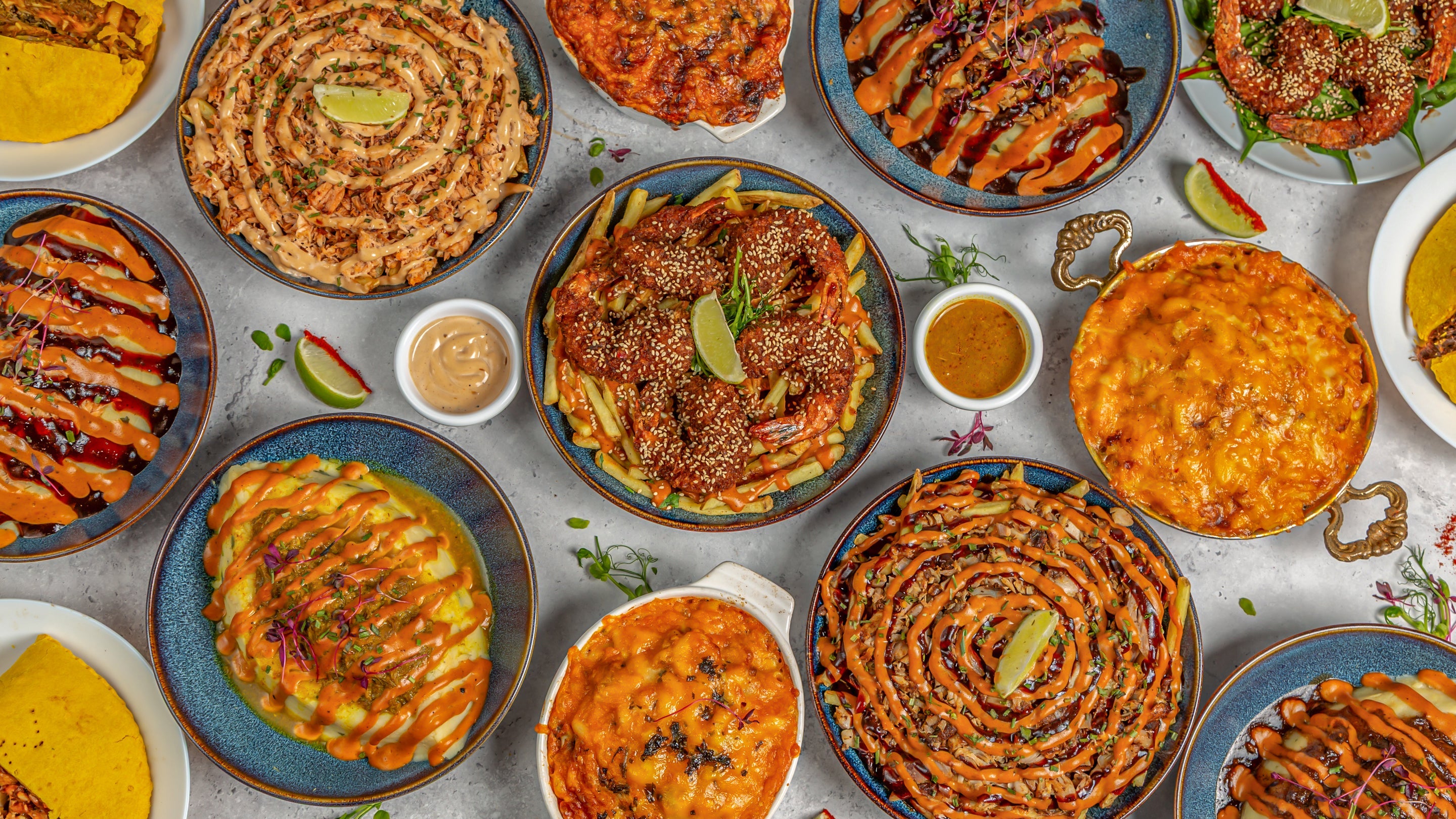 Crispy fries topped with golden battered prawns tossed in a sweet and smoky jerk honey BBQ sauce, finished with a creamy cheese sauce.£16.00Mac and Cheese Loaded Fries