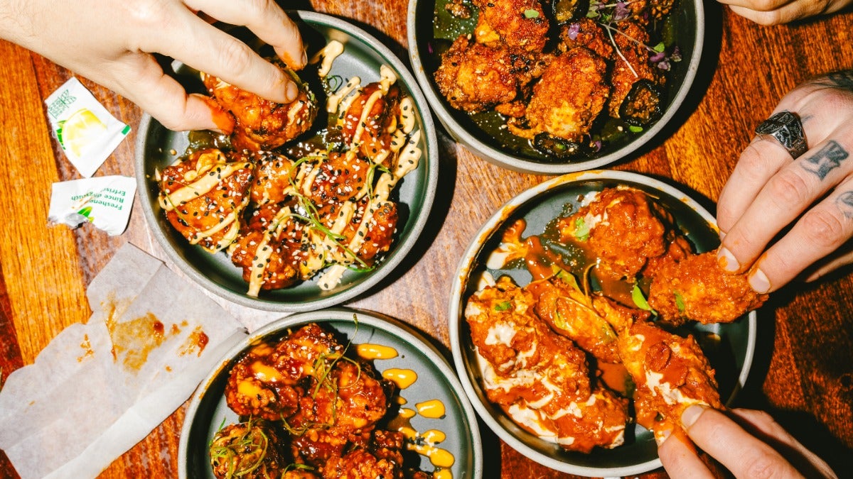 Highly rated· Double-fried chicken wings coated in soy garlic butter sitting on a bed of crispy chicken skins - we like to call Chick-Charonnes! Topped with candied Jalapeños.£13.00Korean Fried Cauli Bites