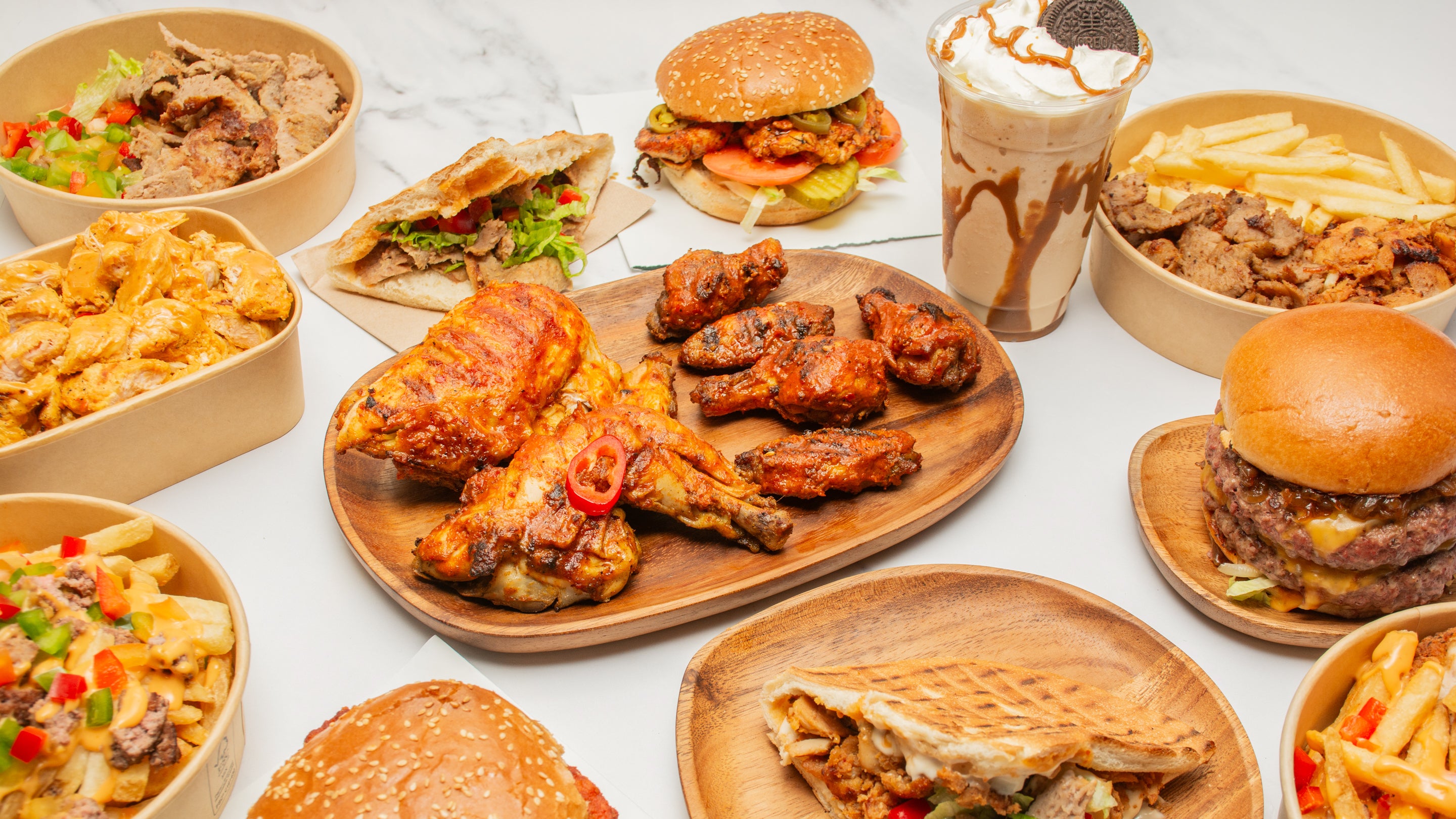 2 Smashed Burger, 2 Buttermilk Chicken, 4pcs Peri Peri Chicken Strip, 4 Sides, 1.5 ltr Drink£42.00