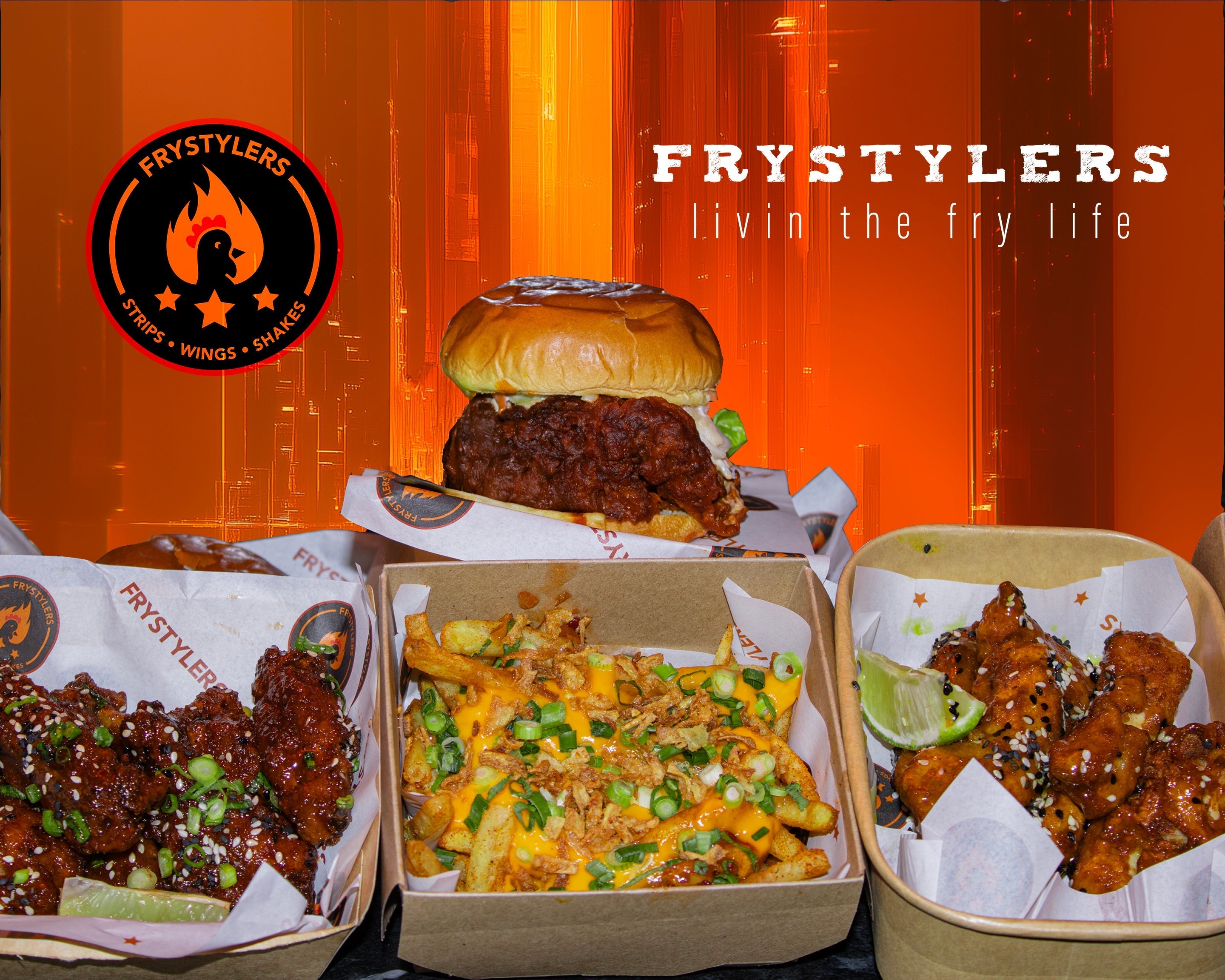 Crispy buttermilk chicken thigh in a soft toasted bun. Juicy inside, crunchy outside. Choose Chicken or Vegan. Smoky BBQ sauce with lettuce and crispy onions.£8.99Frystylers Dynamite 🌶 🌶 (BESTSELLER)