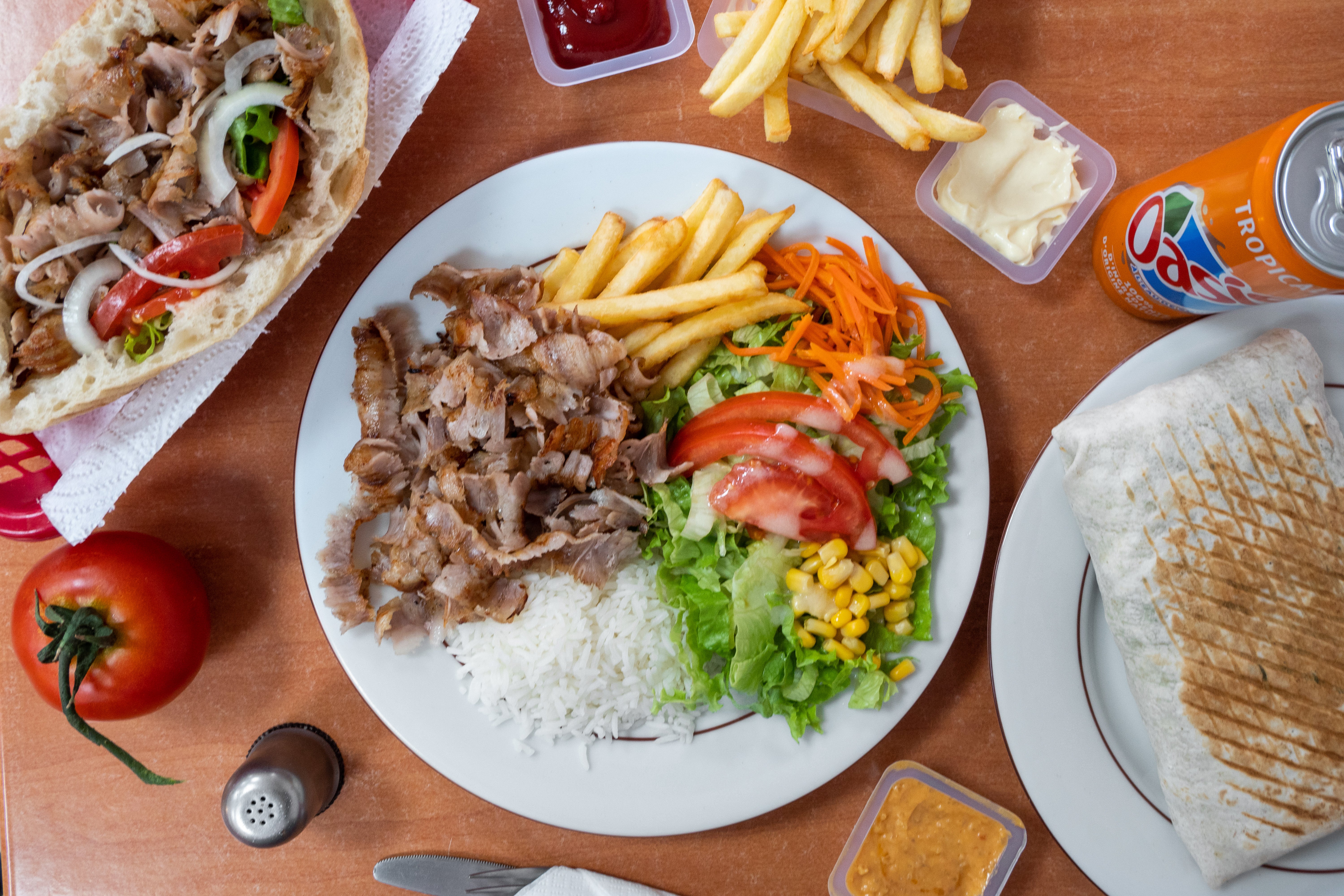 Lamb Shish, kofte kebab, chicken Shish, slices of doner, salad, humus, 4 pitta, chips, pot of sauce and bottle of drink. Leave a note of the bottle of drink and pot of sauce of choice! Everything on our menu is 100%halal.£45.50