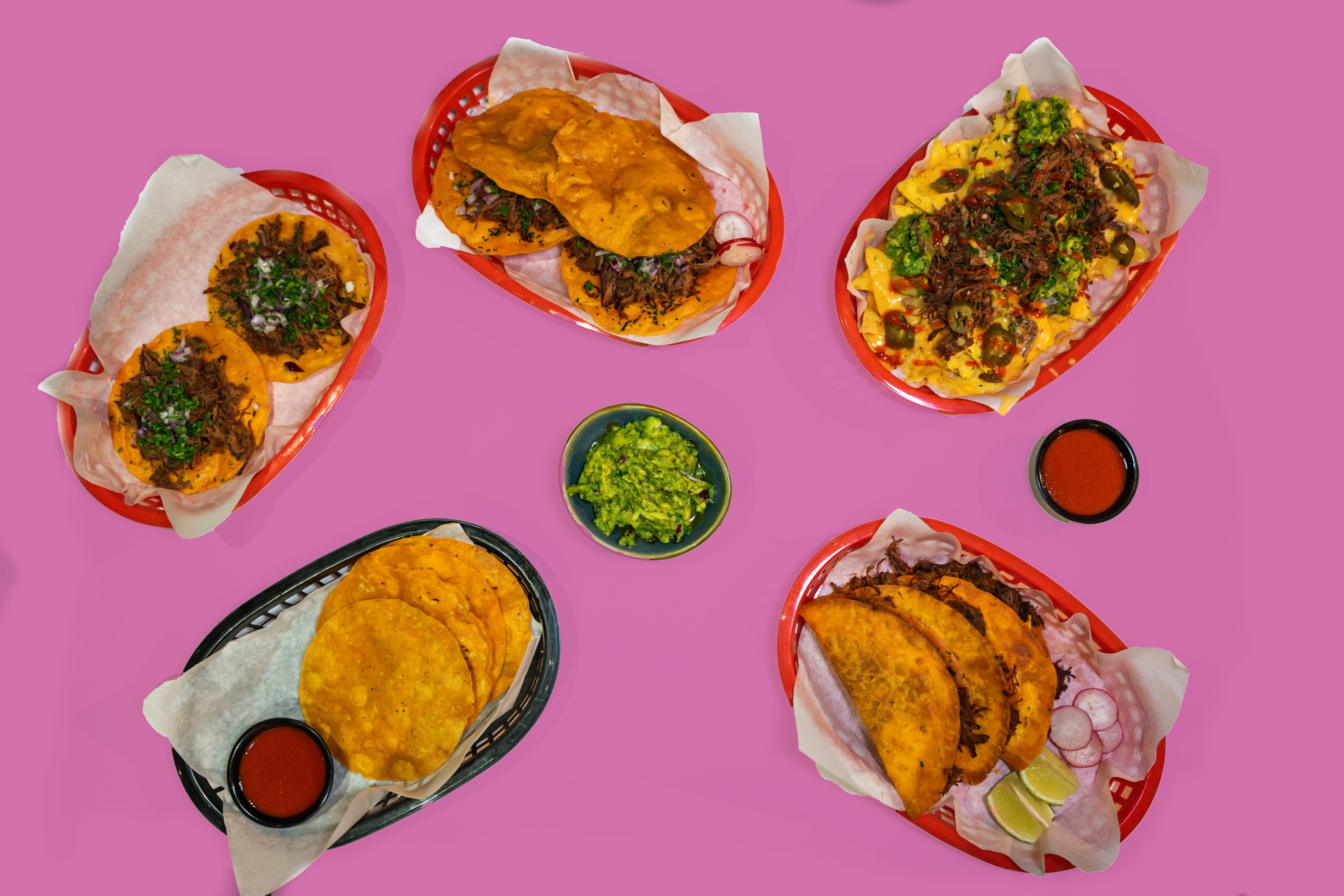 Taco with cheese, Mulita, Tostada, Quesadilla with cheese, 8oz Consume, Tortilla chips.