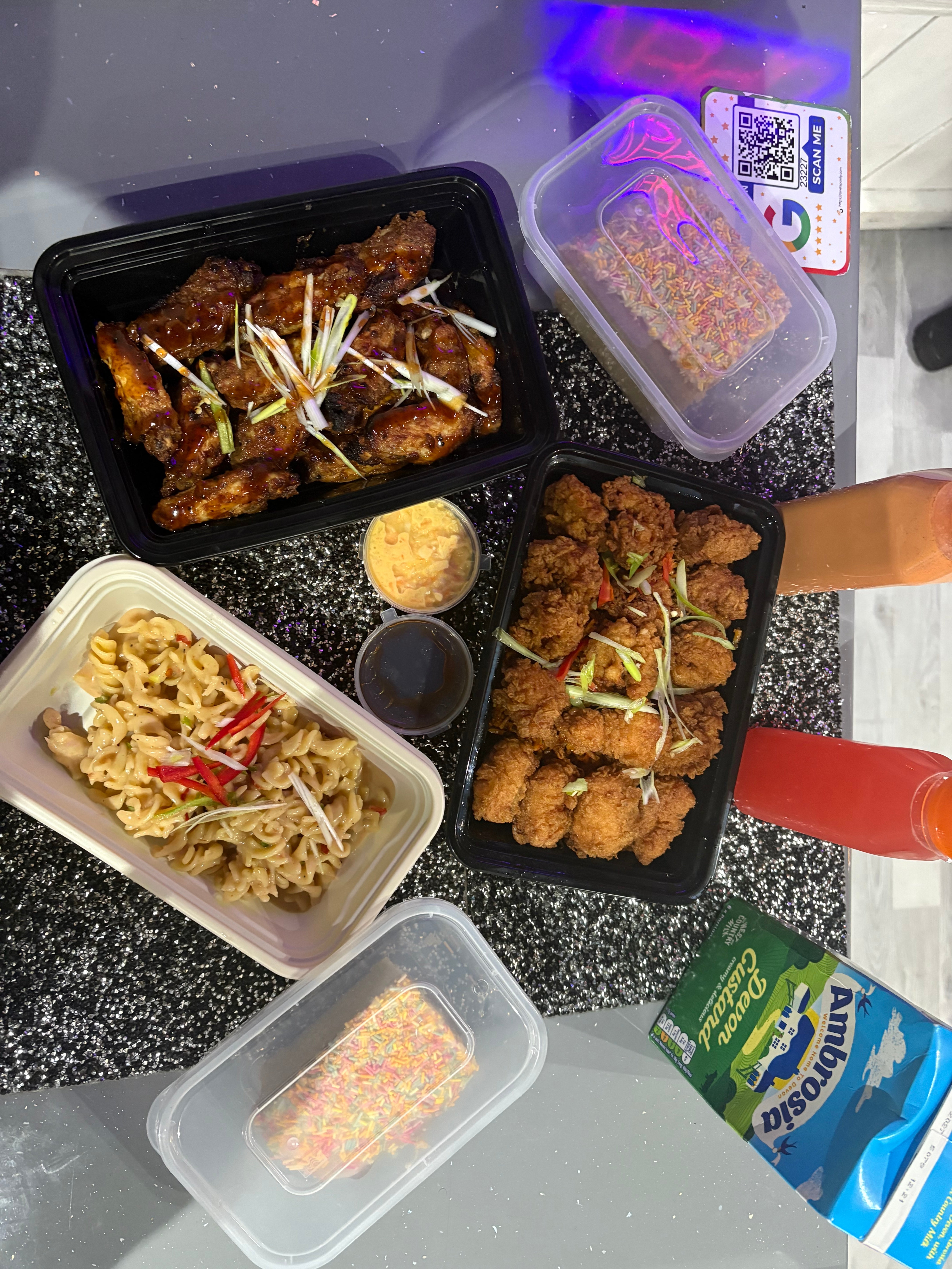Enjoy our flavour-packed Curry Goat or crispy Fried Chicken or Oxtail meal, served hot and hearty, complete with two refreshing drinks to share. Finish on a sweet note with our indulgent dessert bundle — warm School Cake and custard.£35.00£46.502