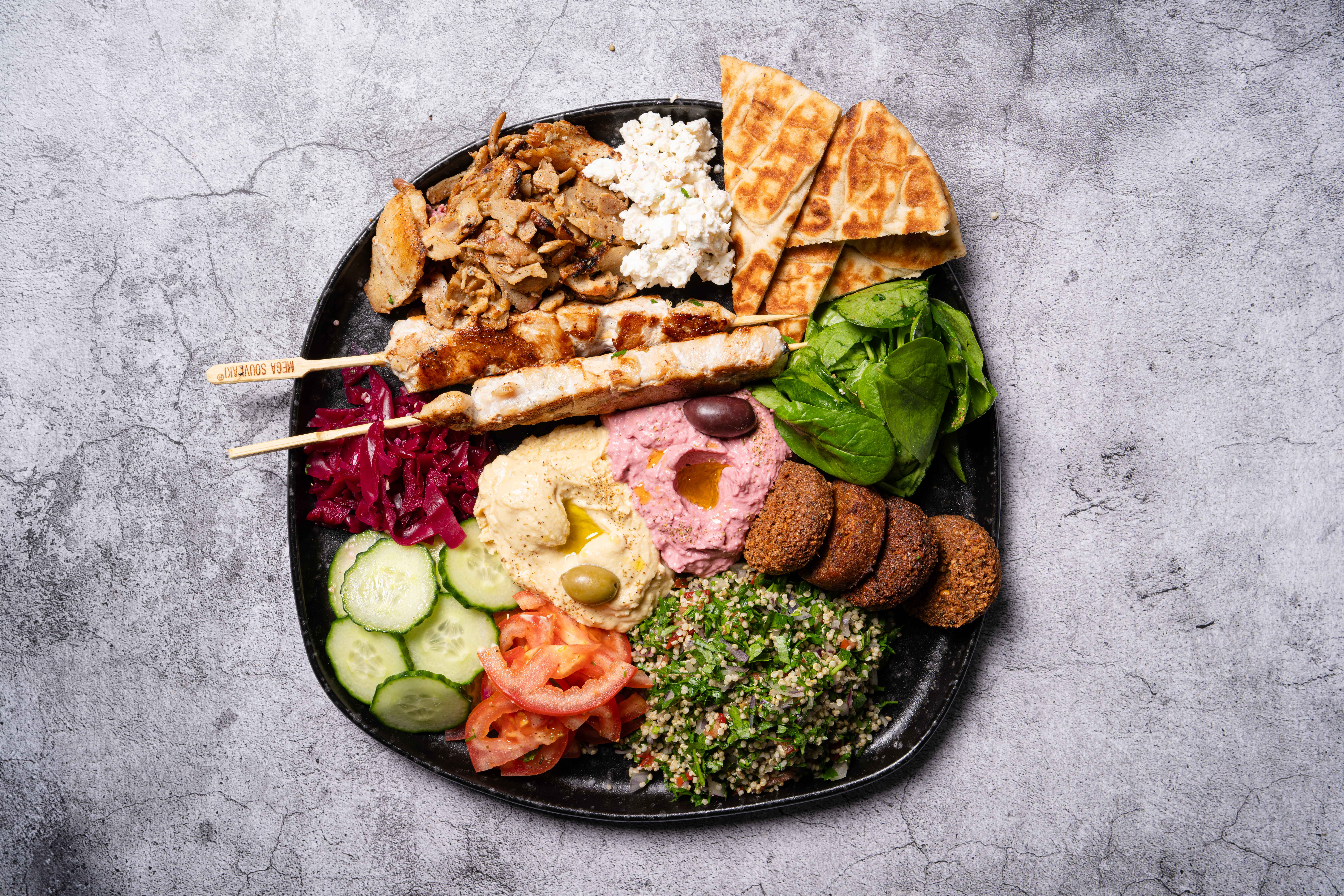 Succulent mix lamb & chicken skewers and beef gyros, bursting with smoky richness are paired with velvety hummus, tangy tabouleh, and crumbled feta served with toasted pita. Pickled onions, olives, tomatoes, and pickled cabbage drizzled with olive oil and herbs, create a majestic feast.£15.99
