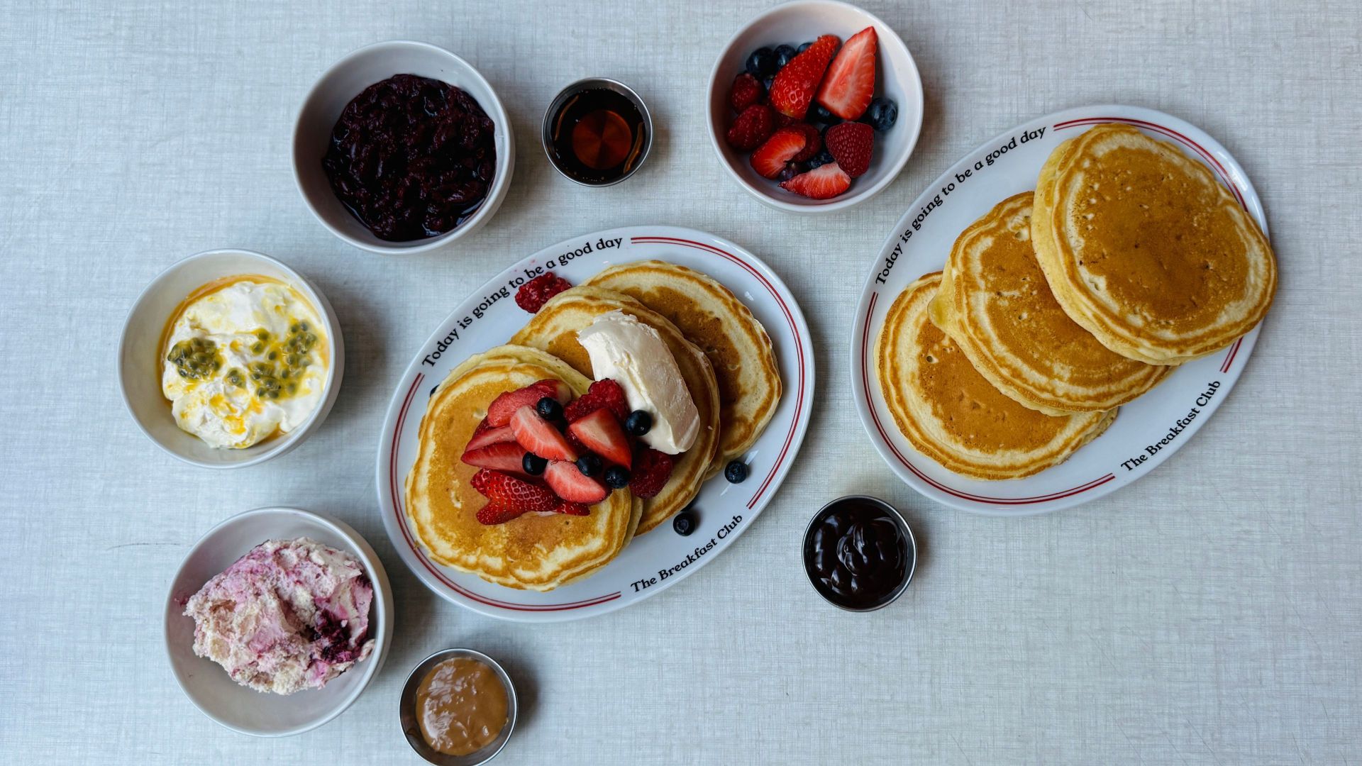 9 stack of our locally world famous pancakes with 3 maple syrup pots and 3 additional toppings£24.00